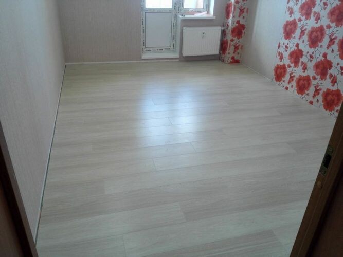 4. Если пол очень неровный (перепады больше 5 мм на метр) — залейте наливной пол или постелите фанеру. На кривой пол линолеум класть нельзя — он быстро порвётся.
