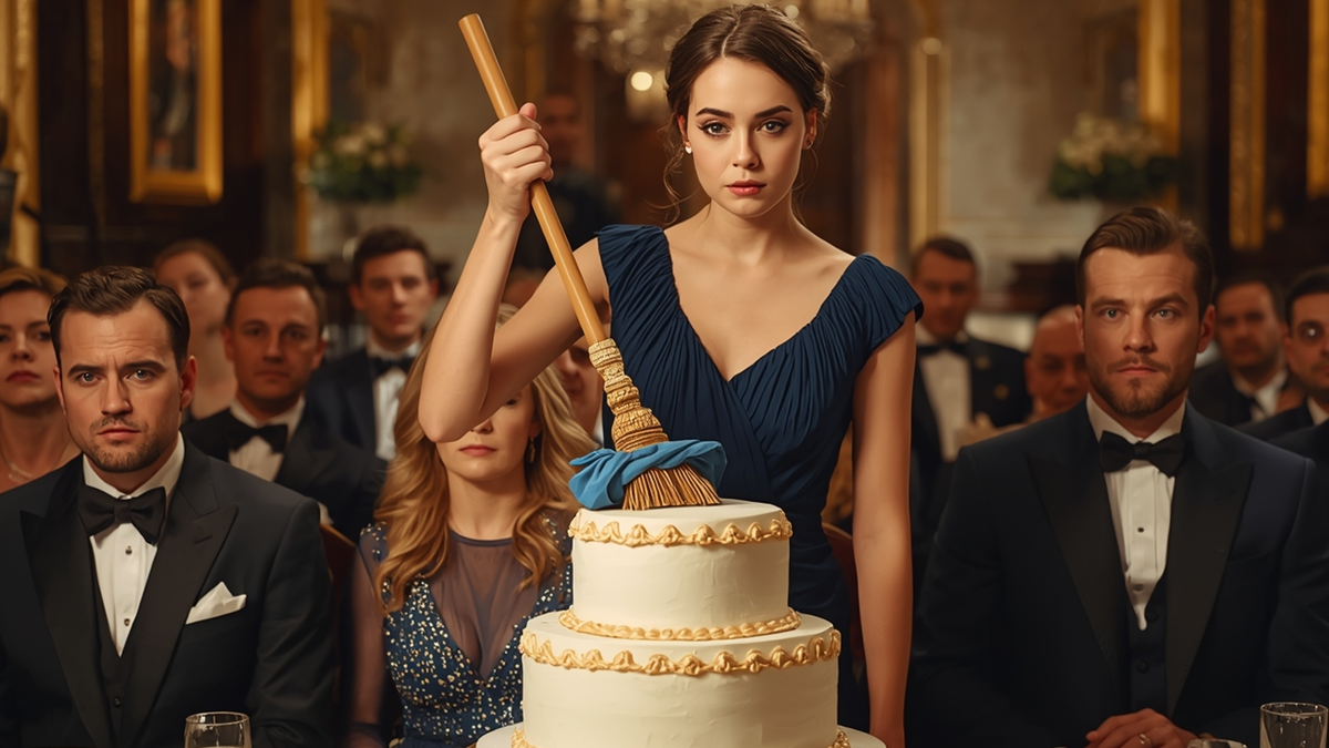 Она посмотрела на швабру в своих руках. Потом на торт. Трёхъярусный, белый, с золотыми узорами. Красивый торт. Очень красивый.