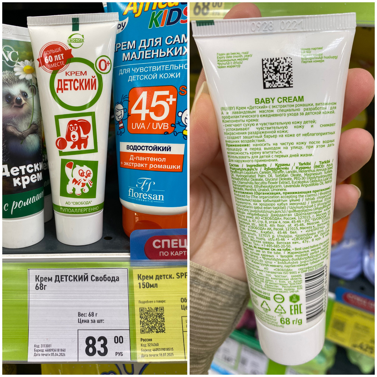 Всем привет. Меня зовут Наталья. Я очень рада видеть вас на своём канале. Сегодня мы с вами прогуляемся по магазину Фикс Прайс, который находится по адресу: город Йошкар-Ола, улица Красноармейская, дом 84 а. В этот раз я подобрала самые спорные новинки. Так что устраивайтесь поудобнее. Желаю всем приятного времяпровождения. Крем "Детский " стоимостью 83 рубля. Масса нетто 68 грамм. Страна изготовления Россия. Данный крем содержит экстракт ромашки, витамин А и масло лаванды, которые смягчают сухую и чувствительную кожу детей; успокаивают чувствительную кожу и снимают покраснения раздражённой кожи; создают защитный барьер на коже от неблагоприятных внешних воздействий. Крем "Детский" с экстрактом ромашки стоимостью 87 рублей. Его объём 75 мл. Страна изготовления Россия. Данный крем предназначен для ухода за кожей ребёнка и сухой кожей взрослых после водных процедур и в жаркое время года. Благодаря ему, кожа становиться увлажнённой и шелковистой. Крем надолго сохраняет ощущение мягкости,