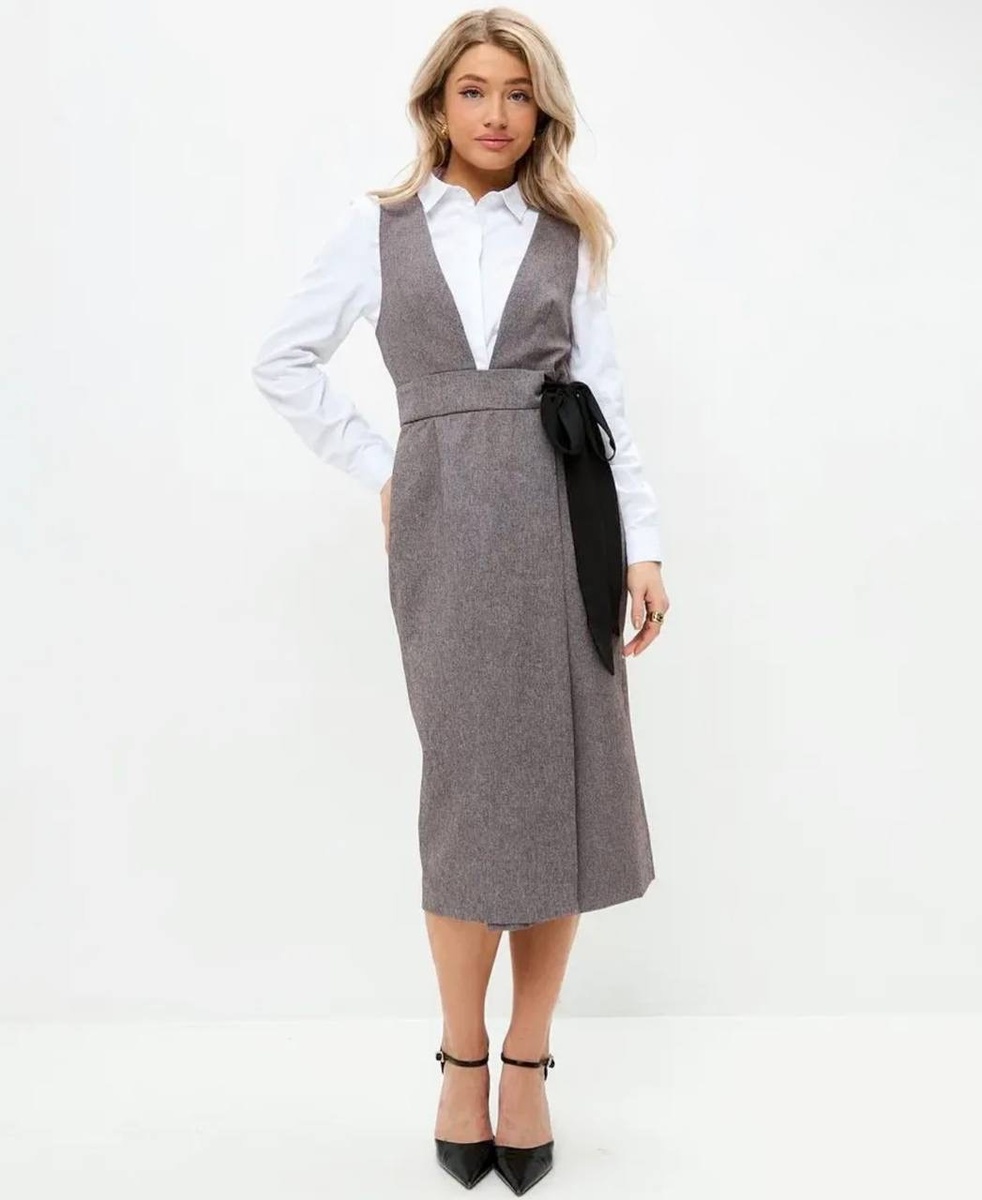 Серый сарафан с глубоким вырезом + белая рубашка — классика, но в более современной подаче. За счёт контраста и пояса образ выглядит продуманно и дорого.