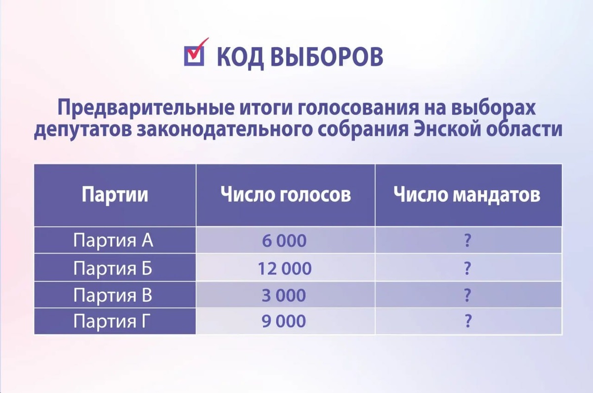 Журналист Иванов ознакомился с предварительными итогами голосования на выборах депутатов законодательного собрания Энской области. Всего в собрание области избираются 20 депутатов. ❓Получит ли какая-либо из партий абсолютное большинство? ❓Какая из партий получит наибольшее количество мандатов относительно других партий? ⚡️ Решение вы узнаете 19 апреля. 🔹 Подписывайтесь на «Электорий» в MAX. #кодвыборов #простоовыборах