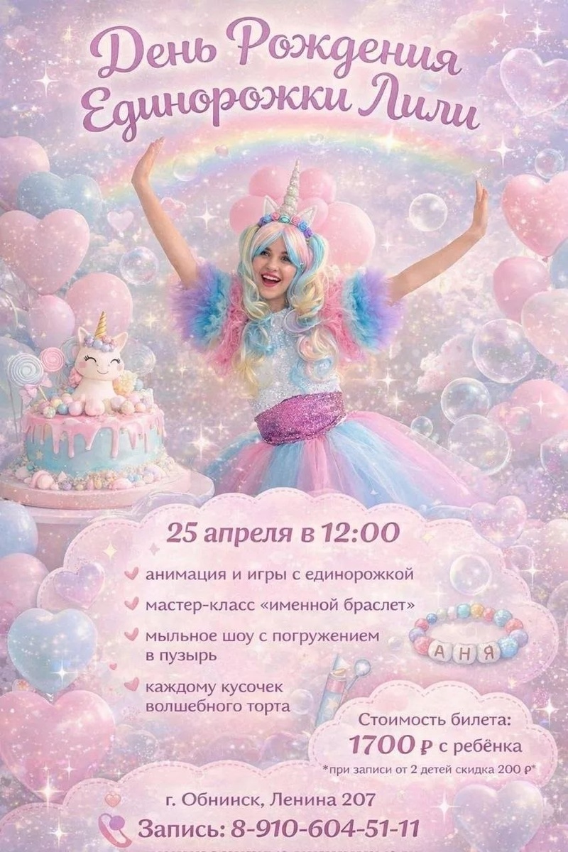 ! 🦄 25 апреля в 12:00 в нашей студии пройдет яркий тематический праздник, где каждый ребенок почувствует себя гостем настоящего дня рождения! Это не просто мероприятие — это полноценная программа с играми, эмоциями и сюрпризами 👇 ✨ В программе: — анимация и активные игры с Единорожкой — необычный мастер-класс: создаем именные браслеты — мини мыльное шоу с погружением в огромный пузырь — каждому ребенку — кусочек праздничного торта с собой 🎂 👦 Важно: программа подойдет и девочкам, и мальчикам Мы сделали праздник активным и разнообразным — будет много подвижных игр, веселья и вау-эффектов, чтобы интересно было всем детям, независимо от пола А еще это отличная возможность познакомиться с форматом наших праздников перед бронированием дня рождения🥳 👶 Рекомендуемый возраст: 4–10 лет ⏰ Длительность: 1,5–2 часа 💰 Стоимость: 1700 ₽ 👨👩👧👦 При записи от 2 детей — скидка 200 ₽ 📍 г. Обнинск, Ленина 207 📲 Запись: 8-910-604-51-11 количество мест ограничено