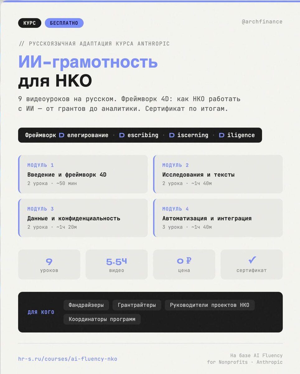 Хорошая штука, но на английском и без адаптации под российские реалии. Мы сделали русскоязычную версию. 9 видеоуроков, 5.5 часов, полностью бесплатно. В основе — фреймворк 4D: — Делегирование: какие задачи отдать ИИ, а какие нет — Описание: как формулировать запросы, чтобы получать результат — Различение: как отличить хороший ответ от галлюцинации — Добросовестность: этика, конфиденциальность, политика использования Практика заточена под НКО: грантовые заявки с ИИ, анализ данных программ без программирования, автоматизация рутины. Конфиденциальность данных — отдельный модуль. Для фандрайзеров, грантрайтеров, руководителей проектов и координаторов программ. Ранее разбирал оригинальные курсы Anthropic Academy — теперь можно проходить на русском и с российскими примерами. Курс ↓ hr-s.ru/courses/ai-fluency-nko #ИИ #Anthropic #НКО — 📱 Макс · 📖 Дзен · ✈️ Telegram · 🌐 hr-s.ru