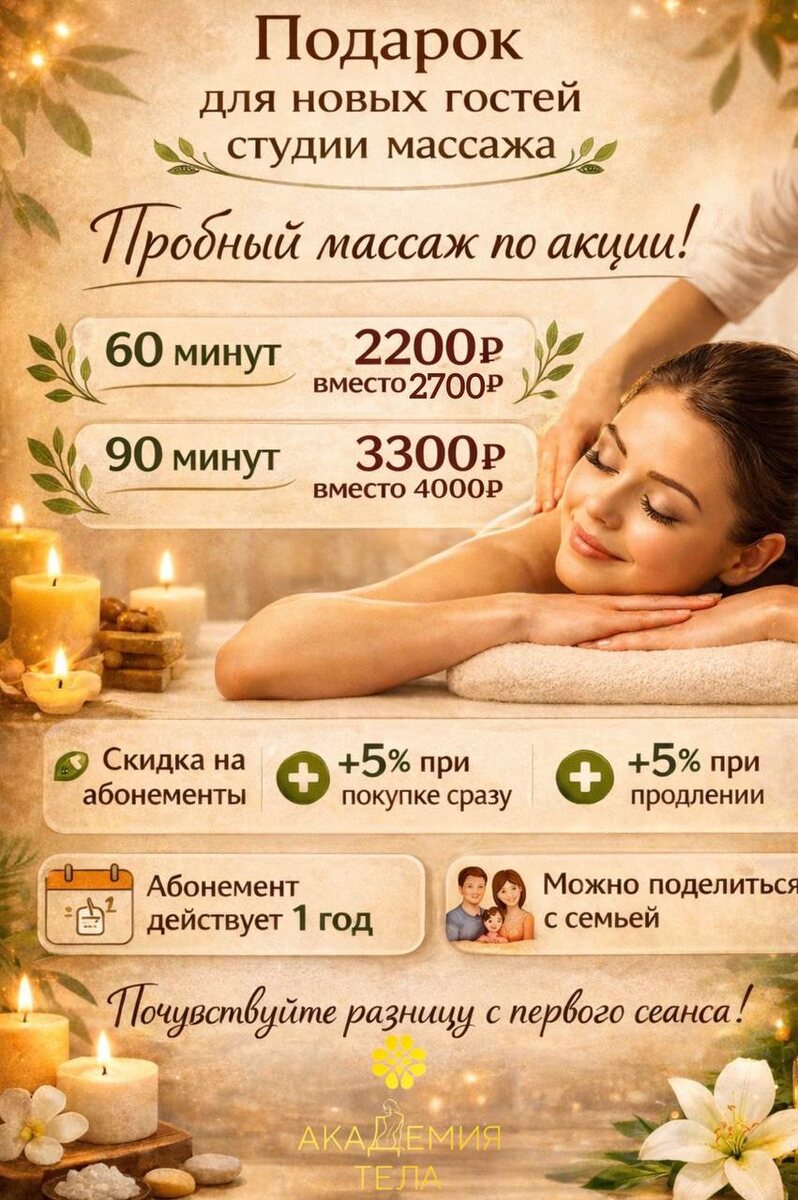 » ✨ Первый визит — это не просто знакомство. Это момент, когда вы впервые чувствуете, как тело действительно может расслабиться, восстановиться и «выдохнуть» 💆♀️ И мы сделали его максимально приятным: 🎁 Пробный массаж по специальной цене: 🔸 60 минут — 2200 вместо 2700 🔸 90 минут — 3300 вместо 4000 Это идеальная возможность попробовать, почувствовать разницу и понять, как ваше тело откликается на качественный массаж. А чтобы эффект был не разовым, а действительно заметным — у нас есть выгодные условия на абонементы: 🔸 Скидка на абонемент уже при первом посещении 🔸 +5% бонуса, если вы оформляете абонемент сразу после сеанса 🔸 ещё +5%, если продлеваете его на последнем визите 💡 И ещё важные преимущества: 🔸 Абонемент действует целый год — вы используете его в комфортном для себя темпе 🔸 Можно делиться с близкими — по абонементу могут приходить члены вашей семьи Почему лучше брать курс? Потому что массаж — это не «разовая процедура», а постепенная работа с телом: 🌿 нап