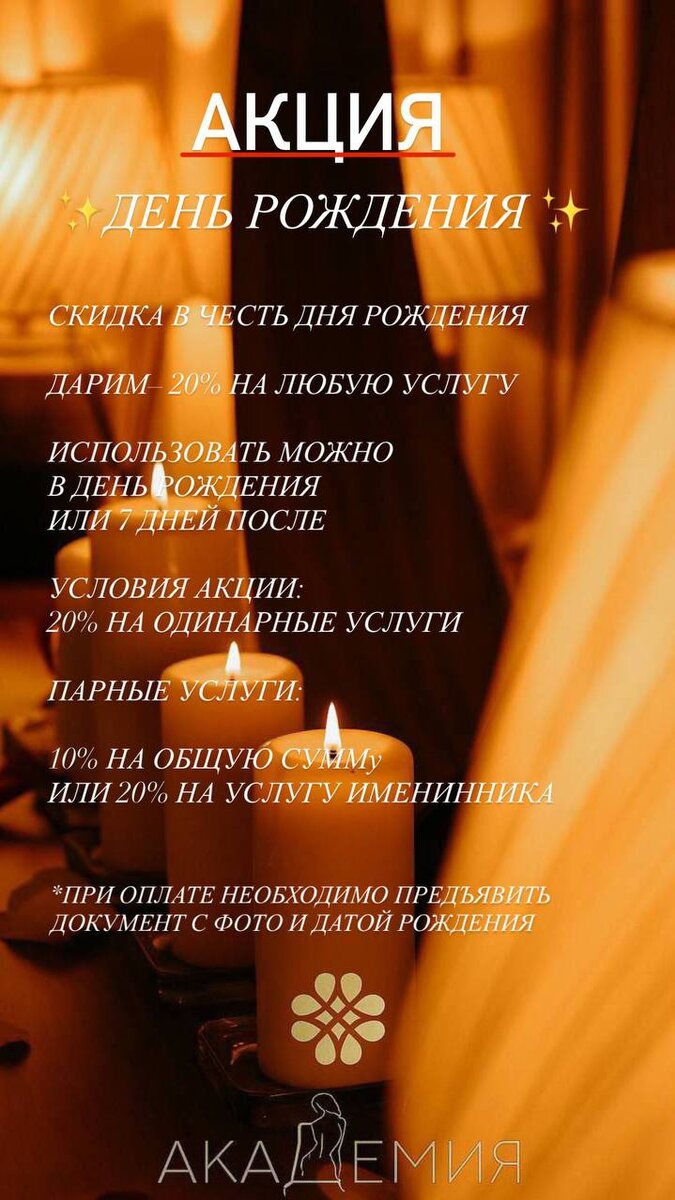 ? 🎂 Мы уверены: этот день должен быть не только про суету, гостей и торт, но и про состояние. Про спокойствие. Про заботу о себе. Про удовольствие от момента. Поэтому у нас действует акция: 🎁 скидка 20% в день рождения и ещё 7 дней после Чтобы вы могли не спешить, выбрать удобное время и провести его так, как действительно хочется. Это может быть: — расслабляющий массаж — полноценная спа-программа — или просто час тишины и восстановления А если хочется разделить этот день с близким человеком 🤍 🎁 на парное посещение действует скидка 10% Иногда лучший подарок — это не вещь, а эмоции и состояние, которое вы проживаете вместе. Многие гости сначала приходят «просто воспользоваться скидкой», а потом возвращаются уже без повода — потому что чувствуют разницу. Важно: вам не нужно подстраиваться под один день. У вас есть ещё 7 дней после — чтобы выбрать комфортное время и прийти в ресурс. А ещё у нас есть свой повод для радости 🤍 Уже через месяц Нашей студии исполнится ровно 1 го
