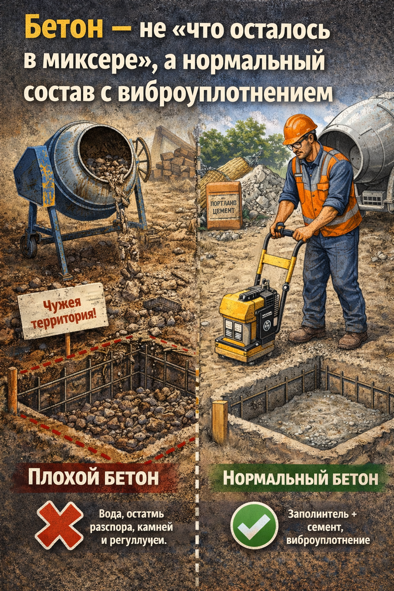 Если коротко. Всё, что делается «из остатков» — это не бетон, а лотерея с предсказуемо плохим финалом. Сегодня стоит, завтра трескается, через сезон начинает крошиться. И потом начинаются разговоры про «плохой цемент» и «мороз виноват». Нет. Виновата технология.