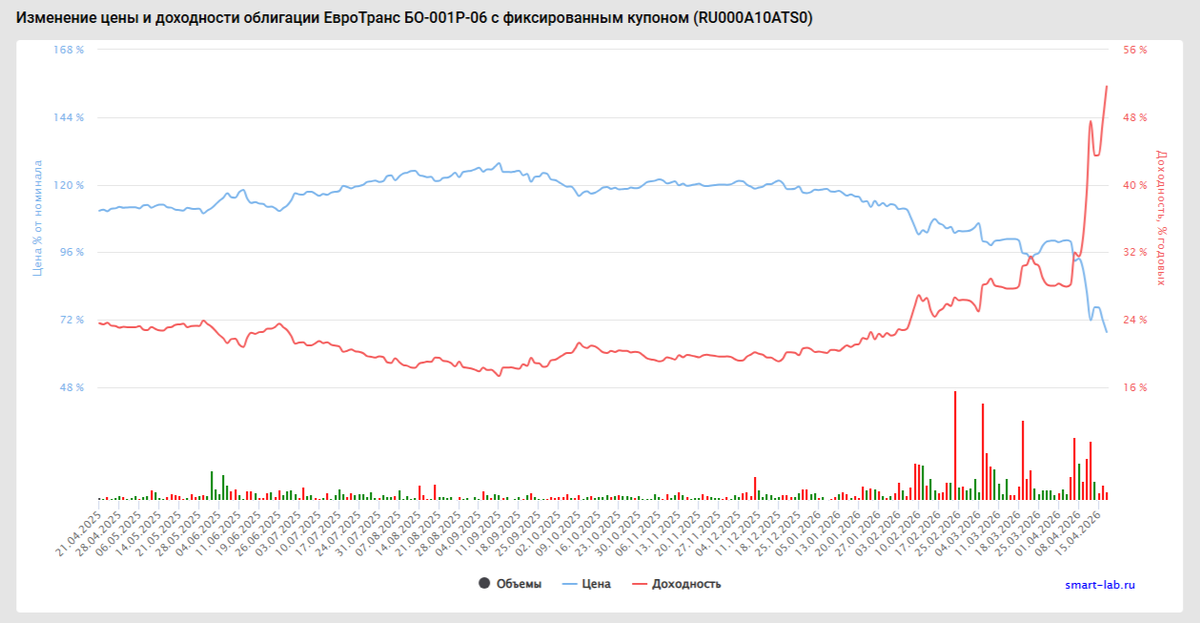 И вот такие движения сейчас постоянно наблюдаются по самым разным эмитентам, Евротранс здесь наиболее яркий пример, потому что у него много выпусков и большой объем. Очень много физлиц владели или еще владеют его облигациями. И эти облигационеры сейчас шарахаются буквально от любого чиха, из-за этого в котировках всегда максимальный шторм.