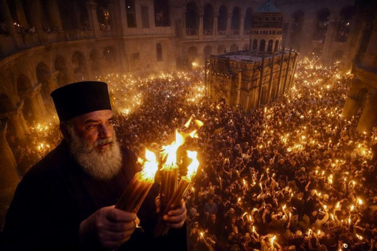 патриарх, и спустя некоторое время выносит пучки зажжённых свечей. Дальше огонь мгновенно расходится по храму, а затем — по странам,