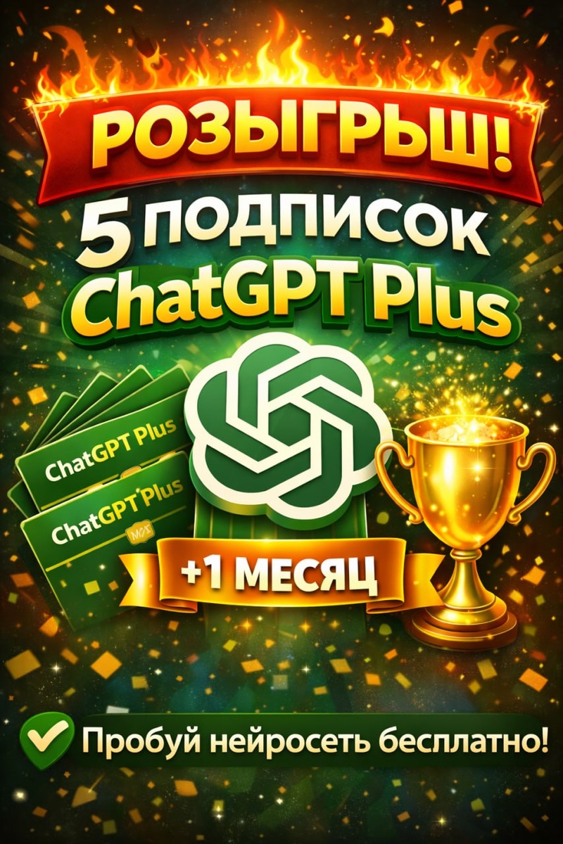 Хочешь нейросеть, которая пишет тексты, делает идеи, помогает с учёбой и даже зарабатывает деньги? 👀 🎁 Разыгрываю 5 подписок ChatGPT Plus (по 1 месяцу) Условия максимально простые: 1️⃣ Подпишись на канал 2️⃣ Поставь лайк ❤️ 3️⃣ Напиши в комментариях «+» 💥 Итоги — через 7 дней, 25 апреля 🎲 Победителей выберу случайно — 💬 Если хочешь забрать без ожидания — напиши в ЛС (подключу на твой аккаунт 🔒 за 460 руб)