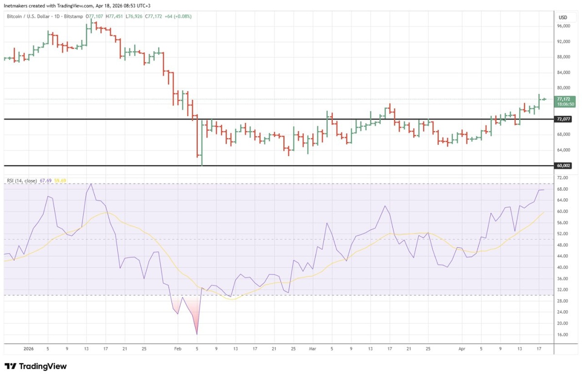 Биткойн постепенно закрепляется на территории бычьего рынка, уже приближаясь к уровню перепроданности по RSI.