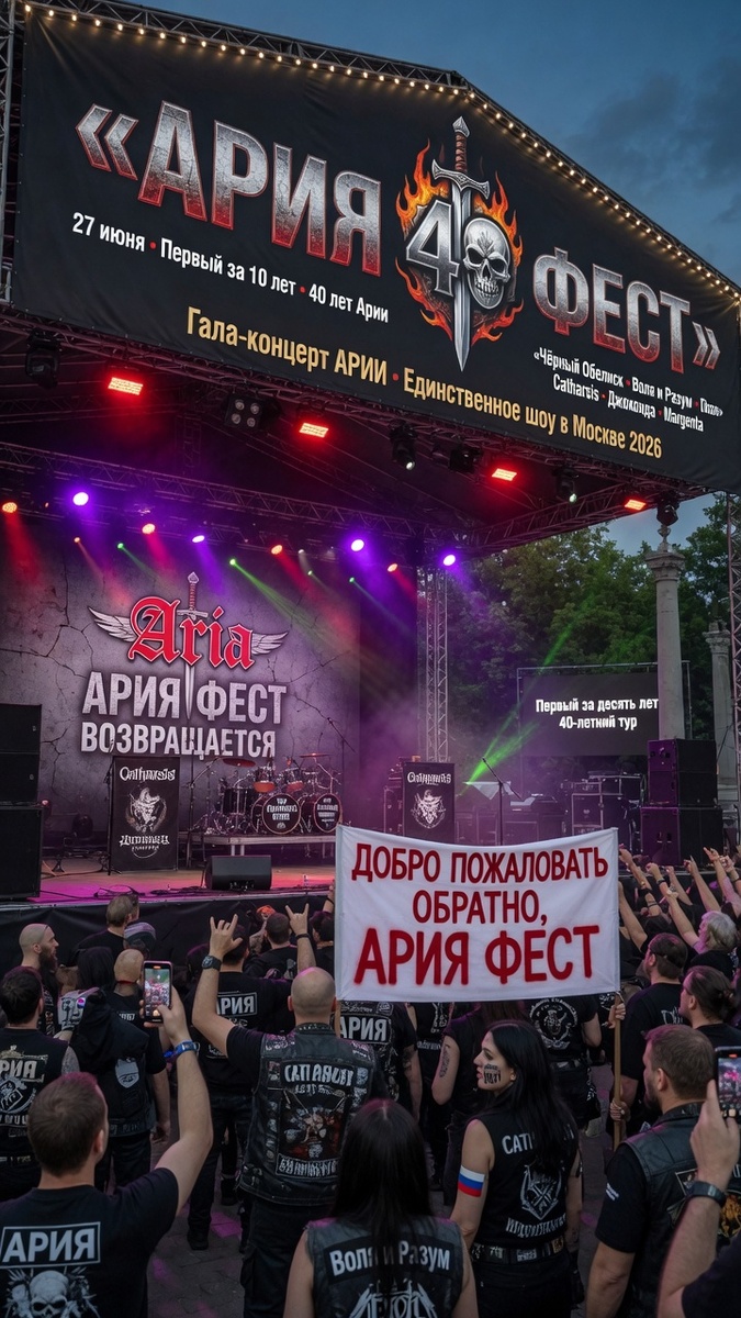 27 июня в Зелёном театре Парка Горького снова загремит «Ария Фест» — первый за десять лет. Ария официально возвращает свой фестиваль и собирает проверенный состав: Чёрный Обелиск, Воля и Разум, Catharsis, Джоконда, Margenta. Финал — гала-концерт самой Арии в рамках 40-летнего тура, и это единственное московское шоу группы в 2026 году. История у феста плотная. Первый запуск в 2010-м под 25-летие, дальше регулярные сборы с сильным лайнапом и гостями уровня Rage, HammerFall, Accept. В 2016 всё затихло — и вот пауза закрывается. Возвращение звучит как чёткий сигнал: сцена снова собирается в одной точке. По реакции уже понятно: металл-сообщество включилось мгновенно. Площадка с историей, знакомые имена и Ария в статусе хедлайнера — формула, которая работает без лишних объяснений. Они снова делают большие события и собирают людей вживую. «Ария Фест» в этом году — как раз такой случай. __ 🔥 Если у вас плохо прогружаются файлы, все рок-новости также доступны в нашем канале в MAX https://ma