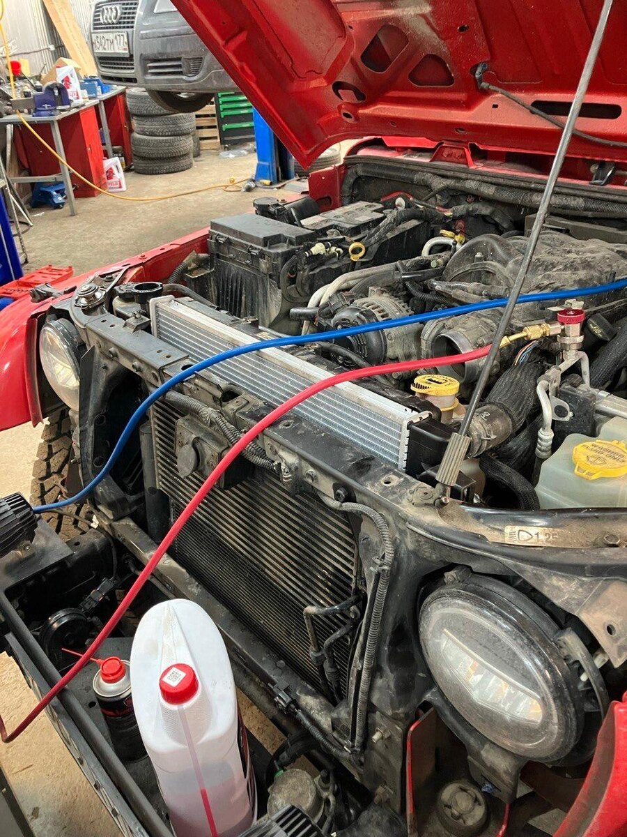 Стандартная работа - замена радиатора охлаждения двигателя. Зная специфику данного мотора, перед проведением работ по замене основного радиатора производим химический анализ охлаждающей жидкости. Это позволяет оценить наличие прорыва газов из камеры сгорания в рубашку системы охлаждения двигателя и сделать вывод о негерметичности газового стыка головки блока и блока цилиндров. Химический анализ производится с помощью специальной жидкости, которая меняет цвет при вступлении в реакцию с углекислым газом, который может попадать в систему охлаждения из камеры сгорания.