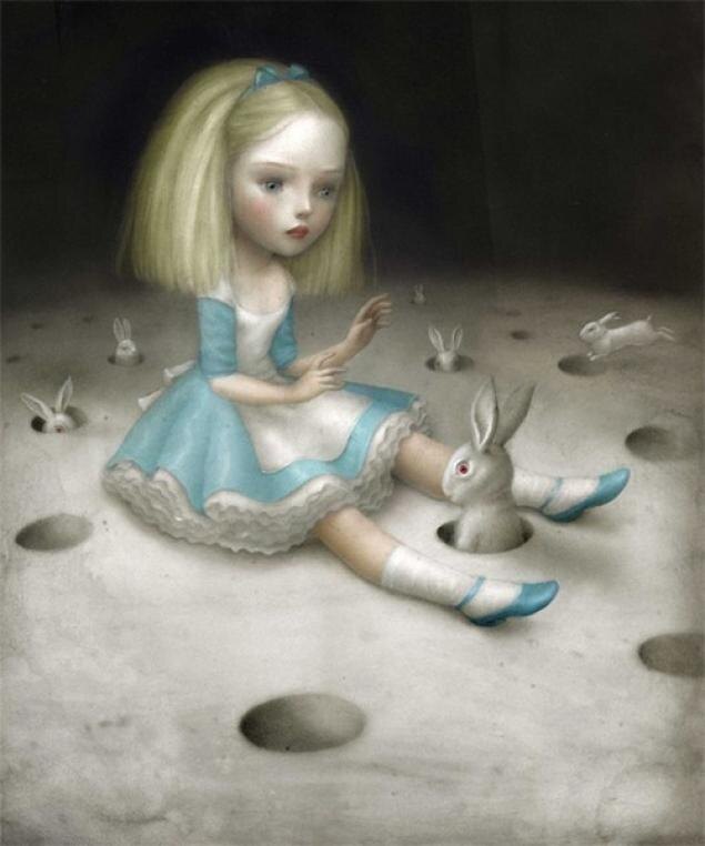 ИЗУЧАЕМ ТАРО НИКОЛЕТТЫ ЧЕККОЛИ ВНИЗ ПО КРОЛИЧЬЕЙ НОРКЕ Сюжет на карте напомнил мне начало книги «Алиса в стране чудес», в которой главная героиня переживает яркие приключения, возможно, самые интересные в ее жизни… Вот он, белый Кролик с красными глазами и жилетным карманом! Вот она, норка, в которой он так молниеносно скрылся! Но откуда же взялись все остальные кролики-клоны? И как узнать из них того, кто так страшно куда-то опаздывал? Алиса гналась за одним Кроликом, а тут их сразу стало так много. В какую норку залезть? Поневоле задумаешься… Интересно, что у девочки, изображенной на карте, какое-то отстраненное, я бы сказала, застывшее выражение лица. Словно перед нами не человек, а кукла. Да и вообще, глядя на карту, создается впечатление, что она отображает эдакий застывший пласт жизни, когда все вокруг замерло и ждет, когда же ты, наконец, сделаешь разумный (во всяком случае, очень хочется в это верить) выбор. Надеюсь, что так и будет. И девочка примет верное решение (волосы на е