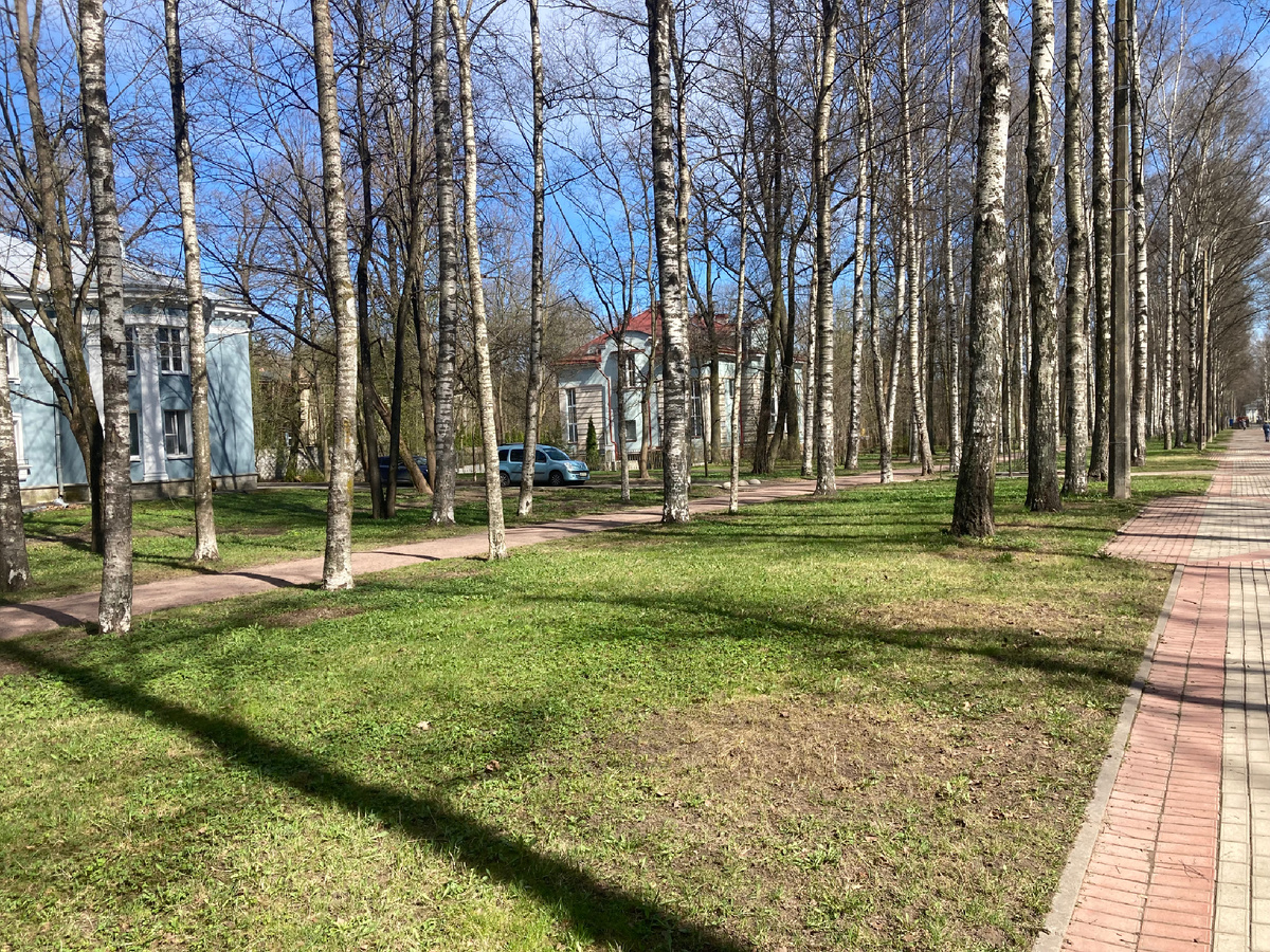 Вчера весь день была в Павловске, обошла все знакомые места. Березовая улица - пешеходная зона в центре города, она длится до самого парка. Красивый дом на Березовой улице, послевоенный. А это пожарный пруд на Березовой, здесь всегда много уток. И рядом растут яблони. Пожарный пруд на этом месте с начала 19 века, наполнялся он водой из городского водопровода, и дальше вода шла в парк и питала пруды и каскады. Цветочки оживают. Хохлатка цветет на солнечных полянках.