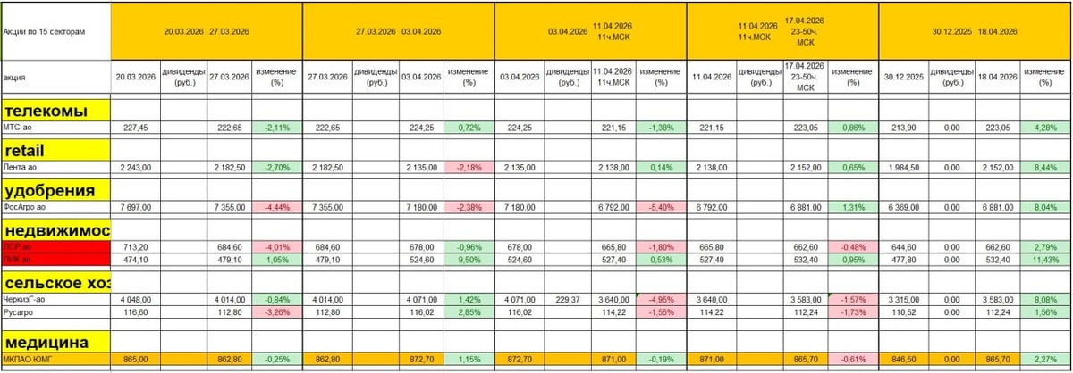 Какие акции в портфелях и почему Анализ трендов По неделям и с 30 12 2025г Красным выделил компании с опасным фундаменталом оранжевым — компании, которые провели IPO посла начала СВО Цены на 17 апреля 23-50 МСК Зелёным (%) выделены изменения лучше индекса полной доходности Мосбиржи Красным хуже Самые надёжные тренды — плавно растущие (на низкой амплитуде) — такой тренд может идти долго Признак окончания тренда — резкий рост амплитуды С начала 2026г лучшие сектора банки (ВТБ, Сбер, Дом.РФ) часть электросетевых компаний (РСетЛЭпр., РСетВол, РСетМР), из розницы Лента ВЫ помните, с начала 2026г выделял именно эти сектора. Покупаю сильные фундаментально акции с сильными трендами. В этой статье — только про анализ трендов