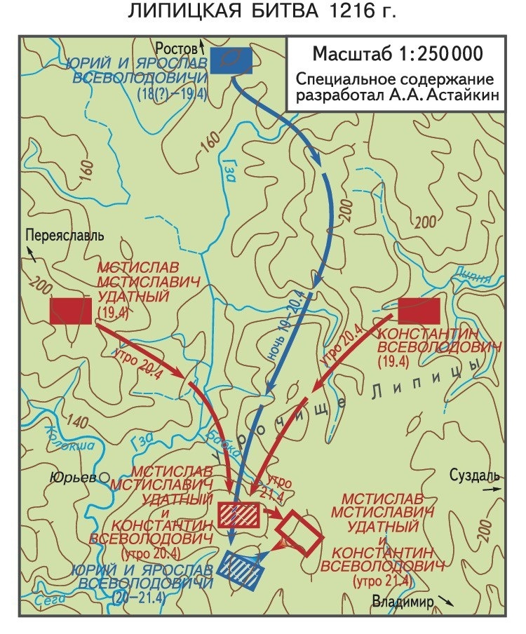 Повесть о Липицкой битве, завершающая историю борьбы сыновей Большого Гнезда, изложена в новгородских летописях и зависящих от них позднейших источниках с небольшими местными добавлениями. Тем красноречивее лаконичность собственно суздальского летописания, которое как бы «стеснялось» этой бесславной для Северо-Восточной Руси темы. Если открыть знаменитую Лаврентьевскую летопись на полном драматизма 1216 годе, там можно найти только самое краткое примиряющее сообщение: «Искони злый дьявол ненавидяй всегда добра роду человечю, паче же христьяном, не хотя дабы не один в вечной муце был, яже есть уготована ему и сущим с ним. Се окаянный дьявол воздвиже некую котору злу межи князи, сыны Всеволожи, Костянтином и Юрием и Ярославом. И бишеся у Юрьева, и одоле Костянтин, но пакы Бог и крест честный, и молитва отца их и дедня. Введе я в великую любовь, и седе Костянтин в Володимере на столе, а Юрьи Суждали, и бысть радость велика в земли Суждальстей, а дьявол един плакаше своея погыбели».