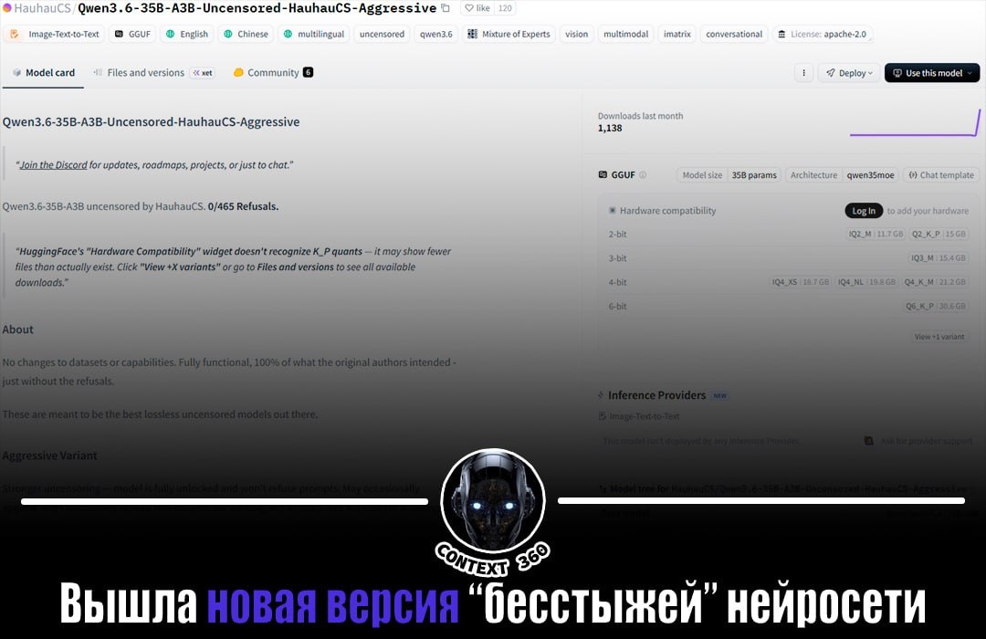 Она спроектирована на базе Qwen3.6-35B, в которой умельцы заботливо вырезали слой выравнивания, что позволило модели отвечать на запросы прямолинейно и не отказывать пользователю ни в чем. Доступны версии от 11,7 до 30,6 ГБ, так что насчет своего железа можно не волноваться. Для работы с ИИ подойдут такие программы, как LM Studio, Ollama, Docker. Подписывайтесь на Контекст 360 Мы в MAX