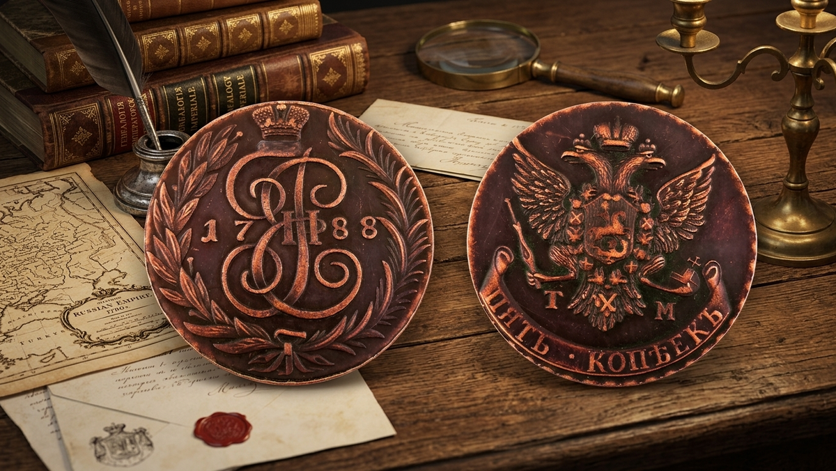 Пятикопеечная монета периода правления Екатерины II — это один из самых узнаваемых символов российской нумизматики. Эти массивные медные деньги весом около 51 грамма стали настоящей легендой благодаря своему внушительному виду и роли в экономике XVIII века. К моменту восшествия Екатерины II на престол в 1762 году, финансовая система страны находилась в сложном положении. Из-за затяжных войн и активного строительства казна нуждалась в средствах, а серебра и золота не хватало. Решением стало использование отечественной меди, которой на Урале было в избытке. Медь стала основным металлом для «народных» денег. Екатерина II практически сразу отменила непопулярные реформы своего предшественника Петра III и вернулась к 16-рублевой монетной стопе: это означало, что из одного пуда меди чеканили монет на сумму 16 рублей. Дизайн пятака не менялся десятилетиями, что сделало его эталоном стабильности: На аверсе: Вензель Екатерины II, состоящий из букв «Е» (Екатерина) и «I» (Императрица), увенчанный