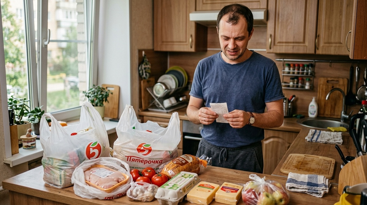 Костя показал чек из «Магнита». Обычный набор: курица, помидоры, сыр, хлеб, яйца, молоко, пачка макарон. Итого 2 740 рублей.