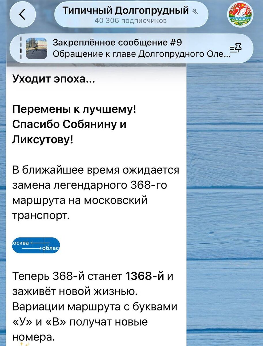 Информация о переводе 368-го маршрута в Московский транспорт — наш эксклюзив, который мы получили на персональных условиях. То, что долгопрудненский паблик украл материал и даже сохранил стилистику — не красит ранее уважаемый канал, который нам всегда нравился. Могли бы написать нам, спросить разрешения. Мы бы не отказали. Сами именно так и работаем. ТД, скатываясь так низко, таскайте откуда хотите. У нас просим не таскать. Мы информируем рекламодателей таких каналов о том, что они финансируют кражу интеллектуальной собственности. 📱 ХимкиGO — это база. 📱 МАХ ХимкиGO — это копия. 📱 Дзен ХимкиGO — это удобная лента новостей. 📱 ВК ХимкиGO — это ВК.