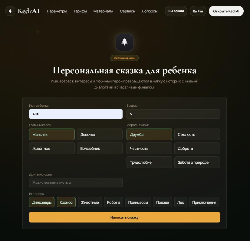 Отзыв нашего пользователя: Моя дочка Соня обожает сказки. Каждый вечер одно и то же: «Мама, придумай про меня». А я после работы — как выжатый лимон. Фантазии ноль, слова заканчиваются на «жили-были». Подруга скинула ссылку на KedrAI и говорит: попробуй сказки. Я скептически покрутила носом — ну что там может быть интересного. Заходишь, вводишь имя ребёнка и его интересы. У Сони это: единороги, танцы и кот Персик. Нажимаешь — и через полминуты получаешь готовую сказку. Никакого VPN, никакой регистрации на старте. Просто открыла и попробовала. Соня фигурировала в сказке как главная героиня — девочка-танцовщица, которая подружилась с единорогом по имени Искра. И её кот Персик там тоже был. Помогал найти волшебный клубок. Дочка слушала с открытым ртом. Потом спросила: «Мама, ты сама придумала?» Я честно сказала — помог компьютер. Она подумала и говорит: «Пусть помогает каждый день». Сказка получается не шаблонной. Там есть имя ребёнка, его любимые вещи, характер — если укажешь. Соня у на