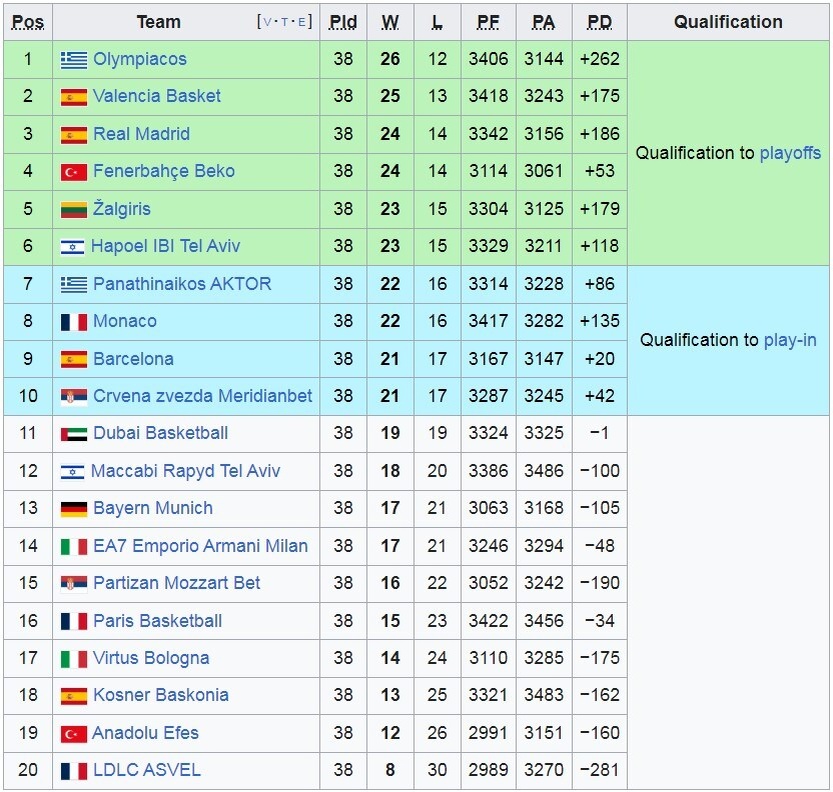 В Евролиге завершился регулярный чемпионат. Второй год подряд победителем регулярного чемпионата стал «Олимпиакос». Греческий клуб и еще пять лучших команд напрямую вышли в четвертьфинал турнира. Более того, уже известны две пары: «Реал» сыграет с «Хапоэлем» из Тель-Авива, а действующий победитель Евролиги «Фенербахче» – с «Жальгирисом». Еще четыре команды («Монако», «Панатинаикос», «Барселона», «Црвена Звезда») сыграют плей-ин. «Барселона» в последнем туре с крупным счётом обыграла «Баварию» и стала последним участником плей-ин. Сильнейший в матче «Панатинаикос» – «Монако» сразу выйдет в четвертьфинал и сыграет там с «Валенсией». А проигравший получит второй шанс, сыграв с победителем противостояния «Барселона» – «Црвена Звезда». Победитель этой сетки выйдет в четвертьфинале на «Олимпиакос». Афинский «Панатинаикос» стал самой посещаемой командой турнира, собирая на домашних матча в среднем 18498 зрителей. Именно на арене греческого клуба в мае пройдёт «Финал четырёх». Также в тройке л