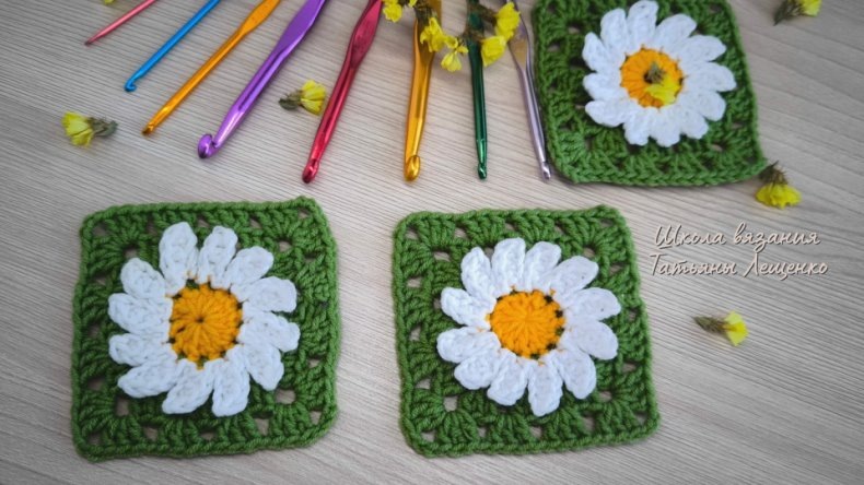 Предлагаю вам рассмотреть три варианта применения объемной ромашки в бабушкином квадрате: