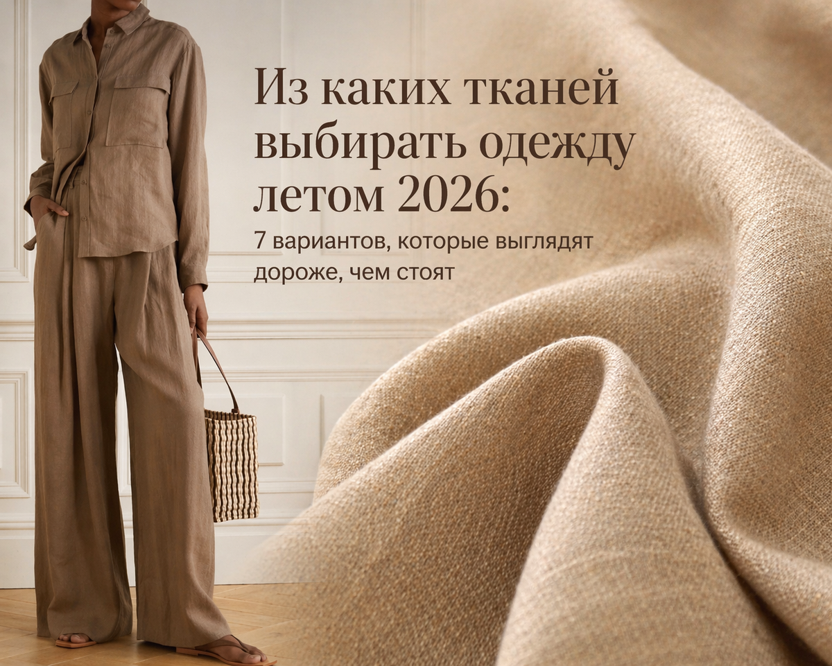 Летом 2026 именно материал часто решает, будет образ смотреться свежо и красиво или сразу даст дешевое впечатление. Лен — один из лучших вариантов на лето. Он дышит, выглядит благородно и делает даже простой образ спокойным и дорогим. Да, чистый лен мнется, но если хочется более аккуратного варианта, стоит смотреть на смесовый лен — с вискозой, хлопком или тенселем. Он сохраняет красивую натуральную фактуру, но в жизни часто оказывается удобнее. Хлопок — понятная база, которая никогда не подводит. Хороший хлопок удобный, приятный к телу и выглядит аккуратнее, чем многие синтетические ткани. Особенно если это рубашка, платье или легкий костюм с хорошей посадкой. Вискоза хороша тем, что красиво струится и делает силуэт мягче. В платьях, юбках и блузах она часто смотрится заметно дороже своей цены. Главное — выбирать ткань получше, потому что дешевая вискоза быстро выдает себя. Лиоцелл, или тенсель, — бол