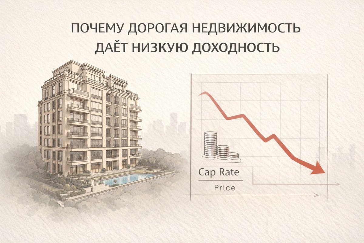 На первый взгляд связь кажется очевидной: более дорогой объект должен приносить более высокий доход. Это интуитивная логика — цена ассоциируется с качеством, а качество с надёжностью и, как следствие, с более высокой доходностью. Однако в недвижимости эта зависимость работает иначе. В наиболее дорогих сегментах рынка доходность, как правило, ниже. Причём это не исключение и не временное отклонение, а устойчивая модель, которую можно наблюдать на разных рынках и в разные периоды. Чтобы понять, почему это происходит, важно посмотреть на сам механизм формирования доходности. Она определяется не абсолютным доходом, а его соотношением с ценой актива. Cap Rate = NOI/Price Если стоимость объекта растёт быстрее, чем его операционный доход, итоговая доходность снижается. И именно это характерно для премиальной недвижимости: цена в ней формируется не только доходом, а гораздо более широким набором факторов. В первую очередь — это структура спроса. Такие объекты приобретаются не только ради текущ