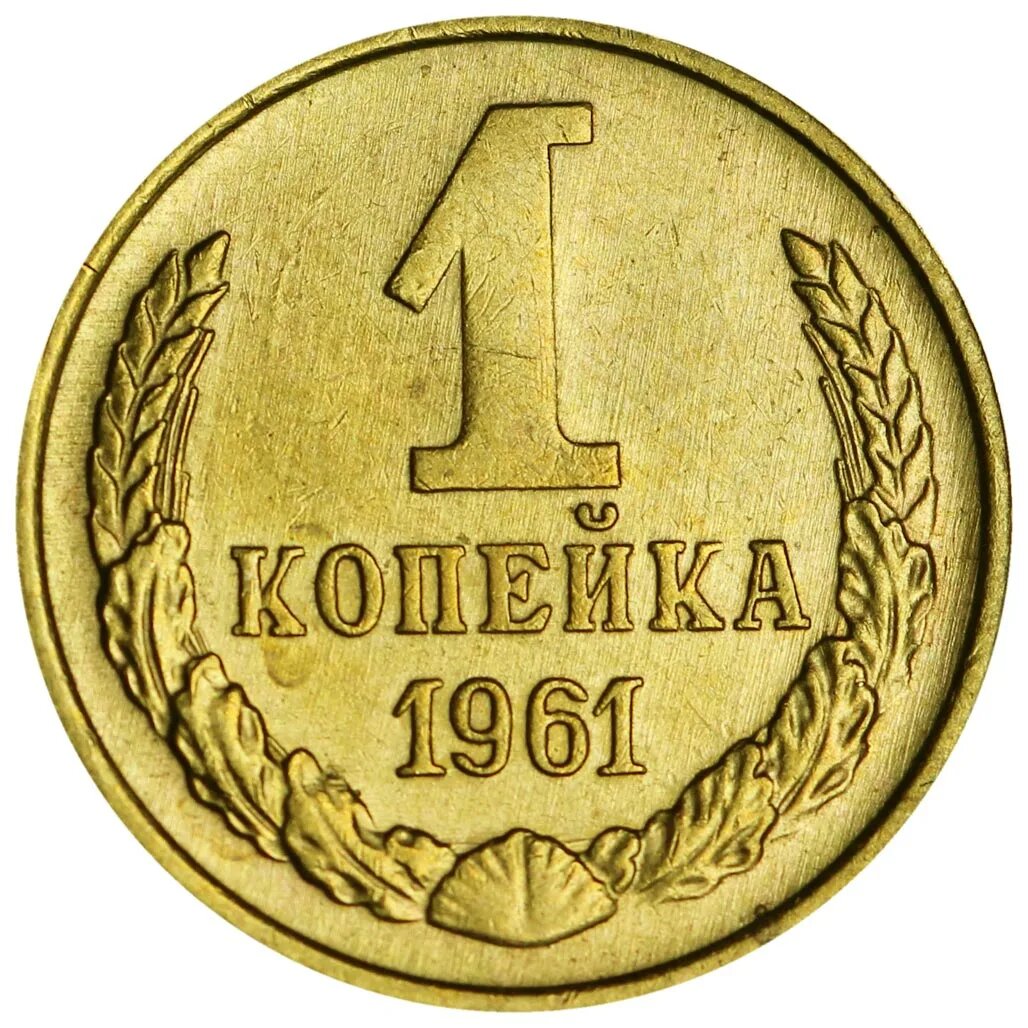 На реверсе монеты обозначен номинал - цифра 1. Под ней, одной горизонтальной строкой прописано название денежной единицы - надпись КОПЕЙКА. Ниже указан год чеканки монеты - дата 1961. Слева и справа полукругом колосья пшеницы, дополненные в нижней части дубовыми листьями ( по три листа на каждый колос). В нижней части поля монеты колосья соединяются в единый полувенок.В месте соединения имеется морская ракушка. По окружности виден чётко выраженный кант. Аверс развёрнут к реверсу на 0 градусов (соотношение сторон медальное). В центре поля аверса монета отчеканен герб СССР образца 1956 года (с 15 витками ленты). Между перевитых лентой колосьев пшеницы, на фоне восходящего солнца и планеты размеченной параллелями и меридианами, серп наложенный на молот - символ, олицетворяющий единство рабочих и крестьян. В верхней части герба — пятиконечная звезда. Под гербом одной горизонтальной строкой прописана аббревиатура государства - надпись СССР. Форма букв округлая. По окружности виден чётко вы