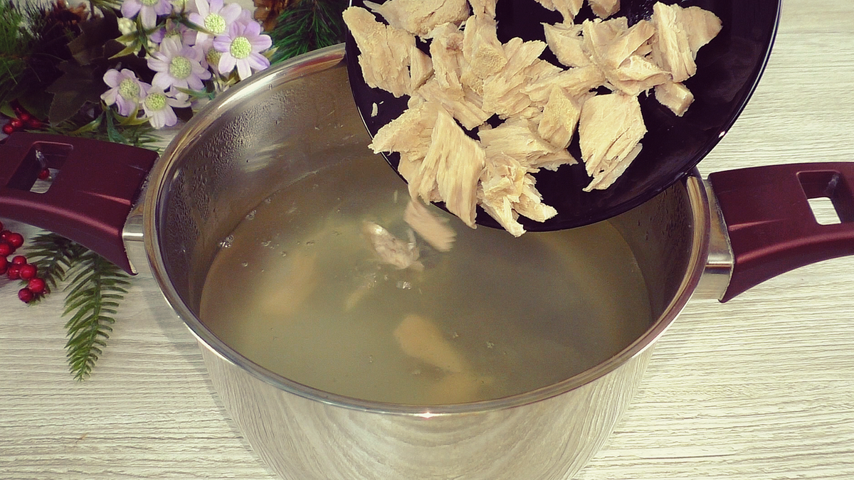 Готовое мясо достать из бульона, освободить от кости, измельчить и вернуть обратно в кастрюлю.