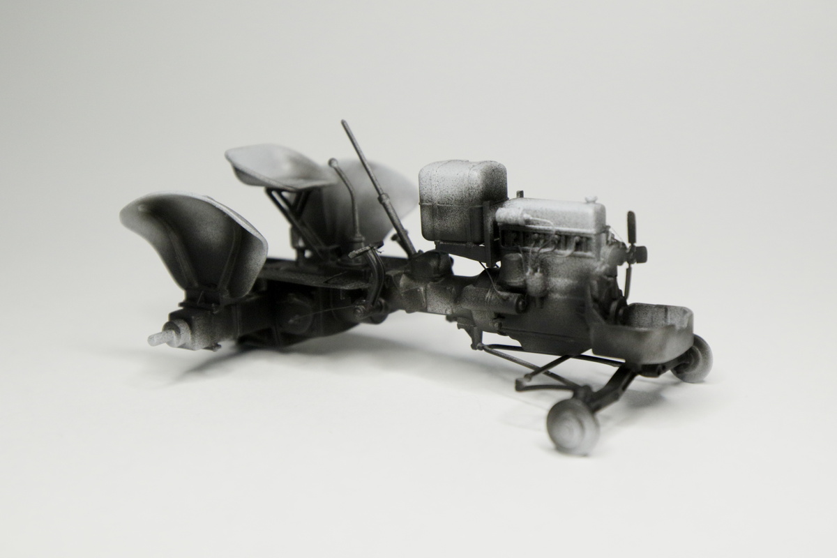В прошлый раз мой рассказ о стройке этой модели остановился на том, что я его собрал, добавил немного деталей от себя и отложил до тех времен, когда смогу начать его красить и визирить. Эти времена наступили. Для начала я модель загрунтовал и напачкал черным. А затем заржавел свой тракторишко. Решил, что он будет старенький и ушатанный в добрых заботливых руках. С моим подходом к планированию окраски и визиринга можно ознакомиться в статье по ссылке: В случае с Case Vai я воспользуюсь им. Итак, чтобы нормально состарить эту модель, мне нужен план, а план определяется легендой. В этом случае она будет такой: трактор служил в армии США. Оттуда его по старости списали и, как водится у американцев, продали с аукциона. Машину купил какой-нибудь фермер, который перекрасил его в свой любимый голубой цвет. Но было это давно, поэтому голубой где-то выцвел, где-то облупился, где-то краска слезла до железа. Отсюда выходит логичный (для меня) план: 1. Сделаю облезшие белые звезды на крышке капота