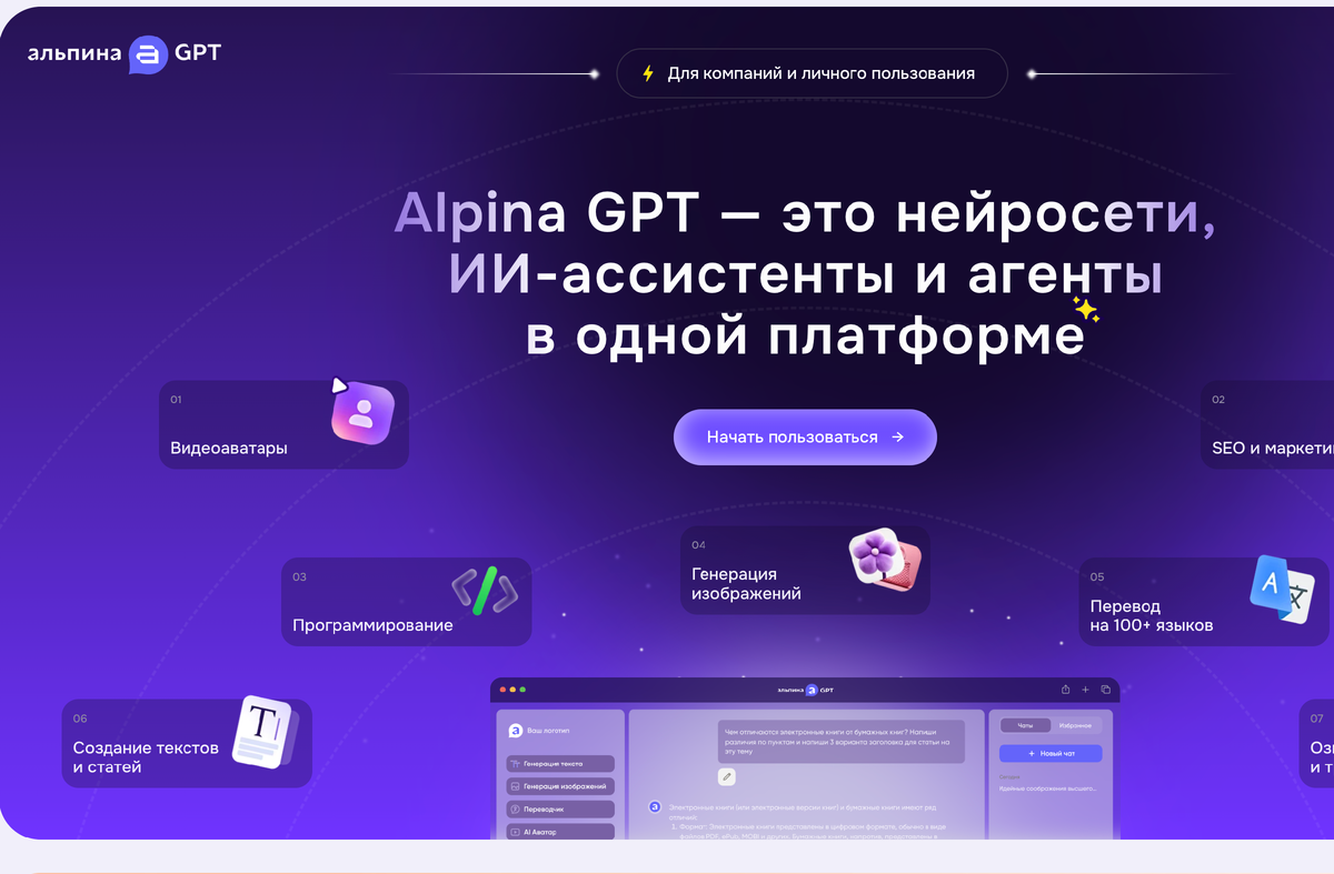 AlpinaGPT — это онлайн-сервис, который объединяет сразу несколько популярных нейросетей в одном интерфейсе. По сути, пользователю предлагают «единое окно» для работы с ИИ: тексты, изображения, перевод, анализ данных и даже генерация видео — всё в одном месте. На первый взгляд идея выглядит логично и даже удобно. Вместо того чтобы регистрироваться в разных сервисах и разбираться с оплатой, здесь обещают собрать всё вместе и упростить доступ к инструментам. Но как обычно, важно смотреть не только на концепцию, но и на детали. Суть платформы довольно простая. Пользователь регистрируется, пополняет баланс и получает доступ к различным моделям искусственного интеллекта. Внутри можно переключаться между ними, комбинировать результаты и решать разные задачи — от написания текстов до генерации изображений. Отдельный акцент сделан на удобстве: