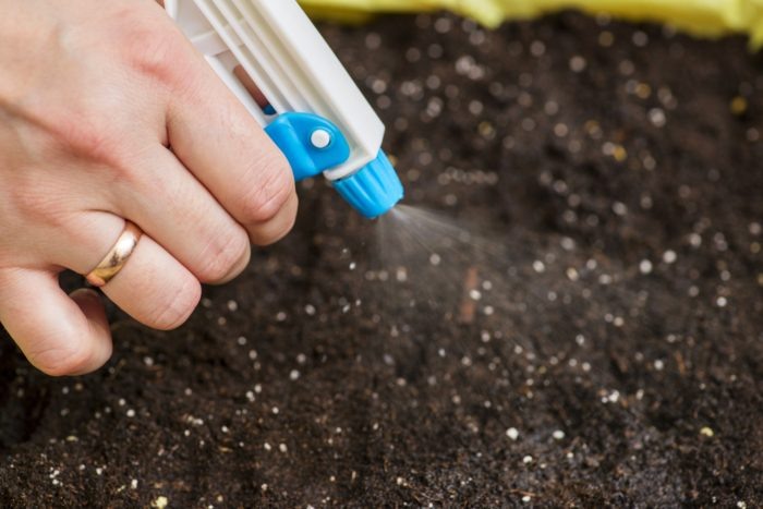 - Пролив раствором марганцовки. Грунт обильно проливают горячим (около 70°C) темно-розовым раствором перманганата калия.