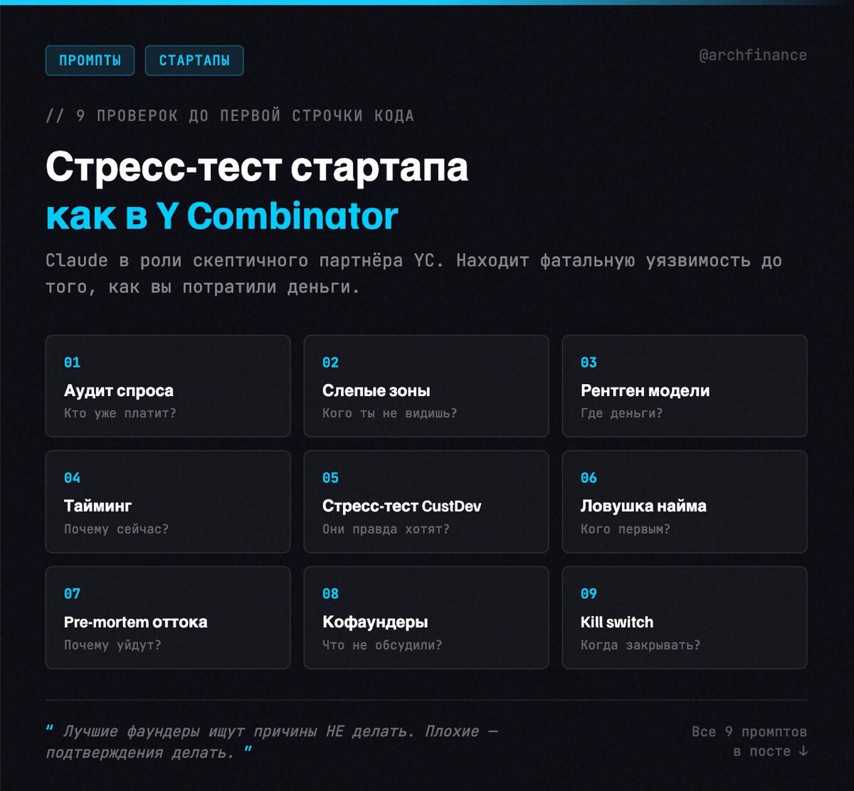 Не потому что гений — потому что задавал правильные вопросы в правильном порядке. Теперь это может Claude. 9 промптов, которые превращают его в скептичного партнёра YC. Каждый бьёт в конкретную слепую зону — до того, как вы потратили деньги. 01 — Аудит спроса: «Кто уже платит?» Скопируйте в Claude: Я строю [продукт] для [аудитории]. Найди 5 существующих решений, которые люди УЖЕ оплачивают для этой проблемы. Для каждого укажи: цену, количество пользователей, главную жалобу клиентов. Если люди не платят ни за одно решение — объясни, почему это красный флаг. 02 — Слепые зоны конкурентов: «Кого ты не видишь?» Вот мой список конкурентов: [список]. Найди 3 конкурента, которых я пропустил: один из смежной индустрии, один непрямой (решает ту же проблему иначе), один из другого региона. Объясни, почему каждый опаснее тех, кого я уже знаю. 03 — Рентген бизнес-модели: «Где деньги?» Моя бизнес-модель: [описание]. Разбери unit-экономику: CAC, LTV, payback period. Назови 3 скрытых расхода, кото