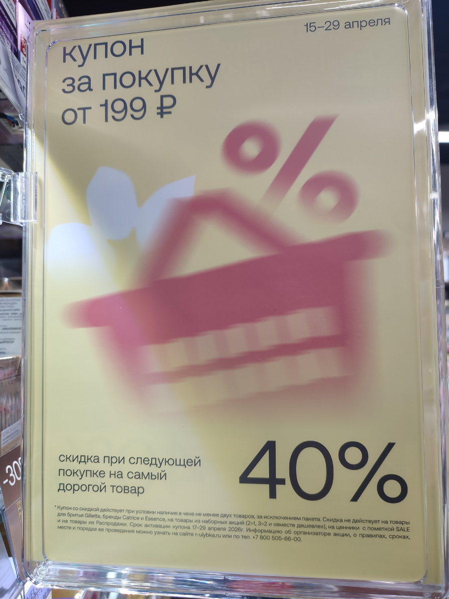 Предложение не суммируется с другими акциями. Акция действует только по карте постоянного покупателя. Если карты нет, её можно бесплатно оформить на кассе и сразу применить.