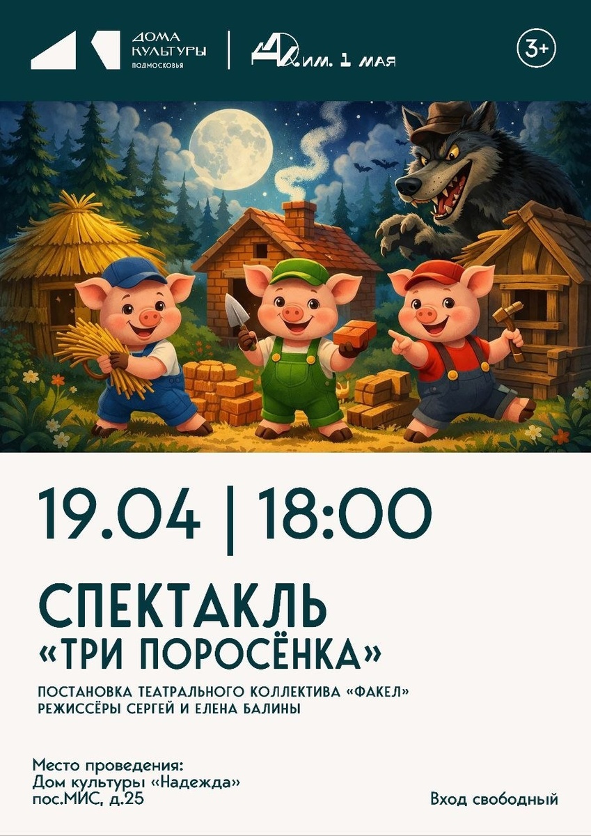 ✨ Спектакль "Три поросёнка" 👉Постановка театрального коллектива "Факел" 🎬Режиссёр Сергей и Елены Балины 🚫 Возраст: 3+ 📆 19.04.2026 🕒 18:00 🏢 Дом культуры "Надежда" 📍 г.о. Подольск, посёлок МИС, 25 💰 Вход свободный❗️ ⭐Поддержать канал голосом 🍰Где поесть в Подольске ✅ Мероприятия Подольск https://dzen.ru/id/66ed500f7b5671493eca3fd6 https://vk.ru/podolsk_events http://dzen.ru/podolsk_events