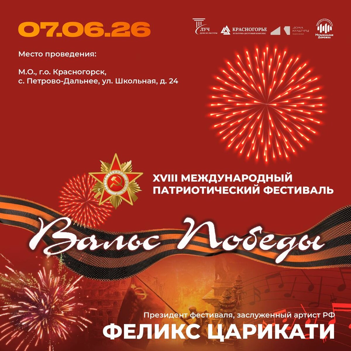 ! Стартует прием заявок на XVIII Международный Патриотический Фестиваль "Вальс Победы"! Президент фестиваля заслуженный артист России Феликс Царикати 🔥 Москва, 7 июня 2026 г. Заявки принимаются до 17 мая 2026г.!!! Место проведения: ДК ЛУЧ, М.О., г.о. Красногорск, с. Петрово-Дальнее, ул. Школьная, 24.: 🎙Концертный зал с большим, светодиодным экраном. Возможен вывод вашего видеоряда. 🎙Профессиональная фото и видеосъёмка и онлайн трансляция. Интервью для СМИ. 🎙Выступление блоками и награждение блоками. 🎙Круглый стол с членами жюри. 🎙Благодарственные письма педагогам. 🎙Победитель получает бесплатное участие в одном из конкурсов проводимых ТИМ Фест (конкурсы - Вальс победы, Новые детские песни о главном, Музыкальная дорожка). 🎙Авторская песня в подарок от основателей фестиваля, авторов песен Екатерины Роговой и Ольги Сердцевой с эксклюзивным правами и многое другое. 🎙Специальный приз (диплом и кубок) от Президента фестиваля заслуженного артиста РФ Феликса Царикати. 🎙По запросу