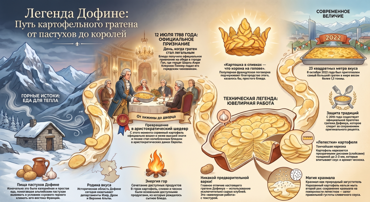История этого шедевра началась в суровых горах Дофине на юго-востоке Франции. Изначально это была простая и сытная еда пастухов, помогавшая согреться в холодном альпийском климате. Официальное признание блюдо получило 12 июля 1788 года, когда его подали на обеде у герцога Клермон-Тоннера. Именно тогда скромный картофель превратился в блюдо, достойное королей и высшей знати. Французы говорят: «Картошка в сливках — что корона на голове». И это чистая правда, ведь настоящий гратен — это не просто запеканка, а ювелирная работа с текстурой. Главное отличие гратена Дофинуа от обычного запеченного картофеля в том, что он готовится исключительно из сырых клубней, нарезанных тончайшими лепестками. Никакой предварительной варки!. Для ресторанного результата на 6-8 порций вам понадобятся: Секрет кроется в картофеле: выбирайте сорта с высоким содержанием крахмала (например, «Синеглазка» или «Гала»). Крахмал — ваш главный союзник, он превращает сливки в густой бархатистый соус. Сливки должны быть м