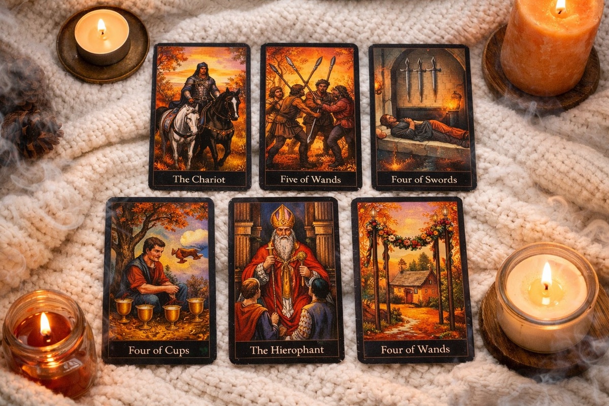 4 жезлов расставляет финальные акценты. Несмотря на текущую апатию, рядом с вами ему уютно. Он видит ваш союз как островок безопасности, где можно снять броню Колесничего и просто быть собой, забыв о военных стратегиях и внутренних драконах. В его душе вспыхивают короткие, но яркие сцены мечтаний: совместный вечер, уютный дом, невидимый, но тёплый праздничный свет.