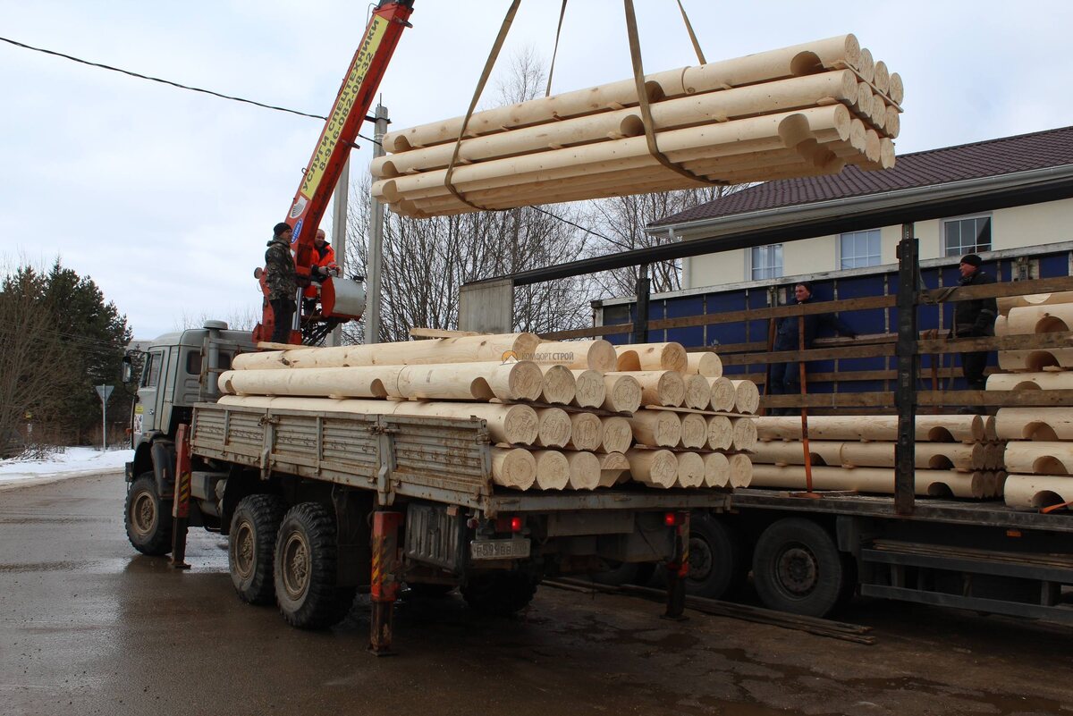 Мы поставляем домокомплекты и пиломатериалы автомобильным транспортом. Еврофура, длина 13,5 м, вместимость (20 т) ~30-32 куб. м в одну автомашину сруба и пиломатериала естественной влажности. До 40 куб. м домокомплекты камерной сушки и пиломатериала влажности 12-14%. Доставка на еврофуре - одна из самых недорогих за счет низкого расхода топлива и возможности взять попутный груз в обратном направлении. То есть вы оплачиваете машину только в одну сторону. Используются только крытые грузовики, чтобы бревно оставалось чистым. Также при доставке домокомплектов следует обращать внимание на подъездные пути к месту выгрузки. При наличии хорошей просторной дороги удобно заказывать еврофуру и кран для разгрузки. А в тесных условиях, вместо крана, КАМАЗ с манипулятором. Это мы всегда уточняем дополнительно, чтобы у Вас не возникло проблем при приёмке домокомплекта. Стоимость доставки зависит от тарифов транспортных компаний, транспортируемого объема, а также от места выгрузки. И важ