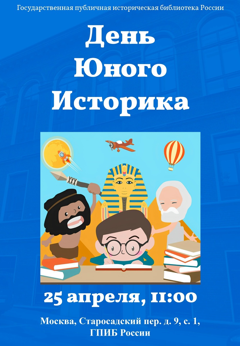 АКЦИЯ «ДЕНЬ ЮНОГО ИСТОРИКА» В субботу, 25 апреля 2026 г. в Государственной публичной исторической библиотеке России будет проводиться «День юного историка». Это профориентационное просветительское мероприятие, нацеленное на формирование у школьников из педагогических, социо-гуманитарных, медиа старших классов интереса к профессиональному развитию в исторической сфере. Данное мероприятие будет способствовать развитию интереса учащихся школ к исторической науке. На мероприятии предполагается провести ряд кратких интерактивных мастер-классов (библиотечных занятий) по археологии и реставрация книг, проведена обзорная экскурсия по зданию ГПИБ России «Историческая библиотека: прошлое и настоящее», а также обобщена информация о возможностях Исторической библиотеки как будущим историкам-исследователям. Библиотечное занятие «Историческая реконструкция: хобби с научным подходом». В ходе занятия посетители узнают о движении исторической реконструкции, о её сути, истоках, а самое главное – о мет