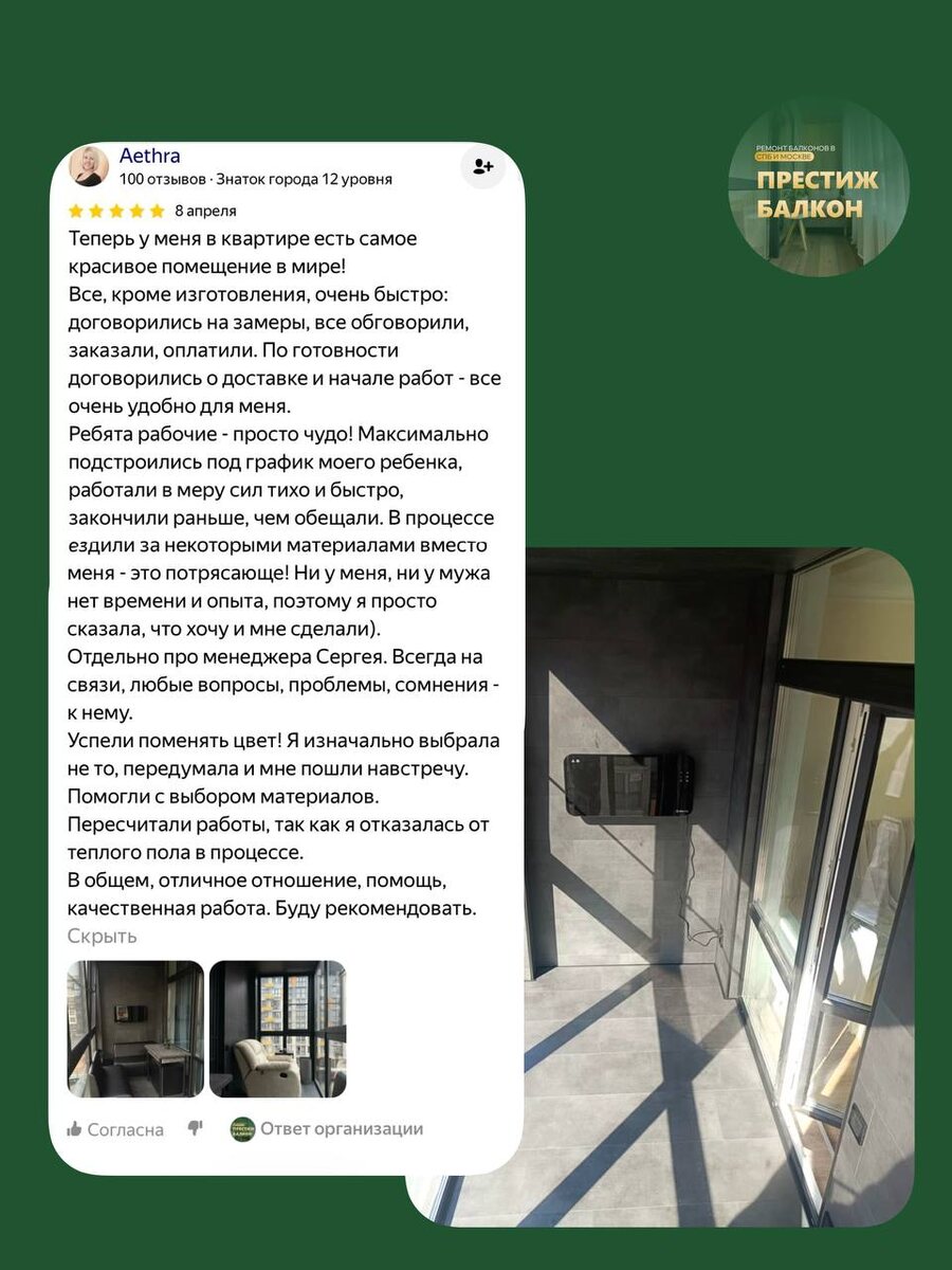 ! 📱 Москва ЖК «Испанские Кварталы» Проделанные работы: ✅ Замена холодного остекления на теплое; ✅ Утепление стен и потолка; ✅ Отделка стен, пола и потолка выполнена плиткой; ✅ Вывод и установка всей электрики; ✅ Замена остекления балконной двери; ✅ Замена холодного остекления на теплое в комнате. Спасибо нашему заказчику за такой шикарный отзыв! Хотите себе такое же уютное пространство? Подпишись ВК | MAX Бесплатная консультация и выезд специалиста: СПб: +78127010779 МСК: +74951320779 💬 Чат с менеджером: @prestig_balkon