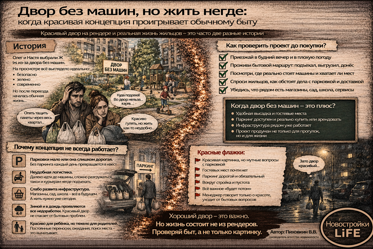 Давай разберём, почему концепция "двор без машин" не всегда работает в пользу жильцов, где тут чаще всего ошибаются покупатели и как понять ещё до сделки, перед тобой действительно сильная среда или просто хорошо упакованный маркетинг.