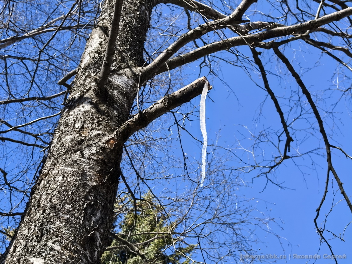 Первый раз такое вижу. Днем тепло, ночью заморозки, поэтому и получается такое чудо природы: сосульки из березового сока. Прямо в центре Архангельска