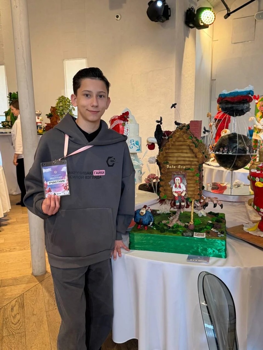 Сказочная избушка на курьих ножках, которая вращается, дымит из трубы и напевает мультяшные заклинания, – это не фантастика, а съедобная реальность. Именно такой торт-шедевр привёз в Москву 13-летний житель Геленджика Ярослав Елисеев и завоевал серебряную медаль на Международном чемпионате по антигравитационным тортам. Вернувшись с конкурса, Ярослав вместе с мамой Полиной стали гостями редакции «Прибоя». Произведение искусства весом 18 килограммов везли на поезде. Для транспортировки папа Ярослава сварил специальную металлическую конструкцию. На ВДНХ, где проходил чемпионат в рамках темы «Россия объединяет», работа школьника из Геленджика произвела настоящий фурор. «Я пересмотрел мультфильм про русских богатырей и понял: избушка – это символ единства фольклора и технологий», – объясняет свой выбор Ярослав Елисеев. Технологий, а точнее спецэффектов, в его кондитерском шедевре было предостаточно. Избушка плавно вращалась на «куриной ножке». В резных окошках загорался уютный свет. «Я исп