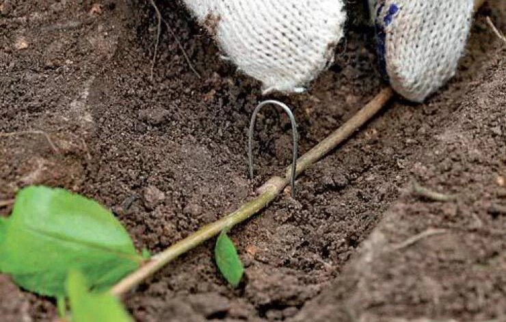 Пригибание: Однолетние побеги укладывают в бороздки, пришпиливают крючками из проволоки.