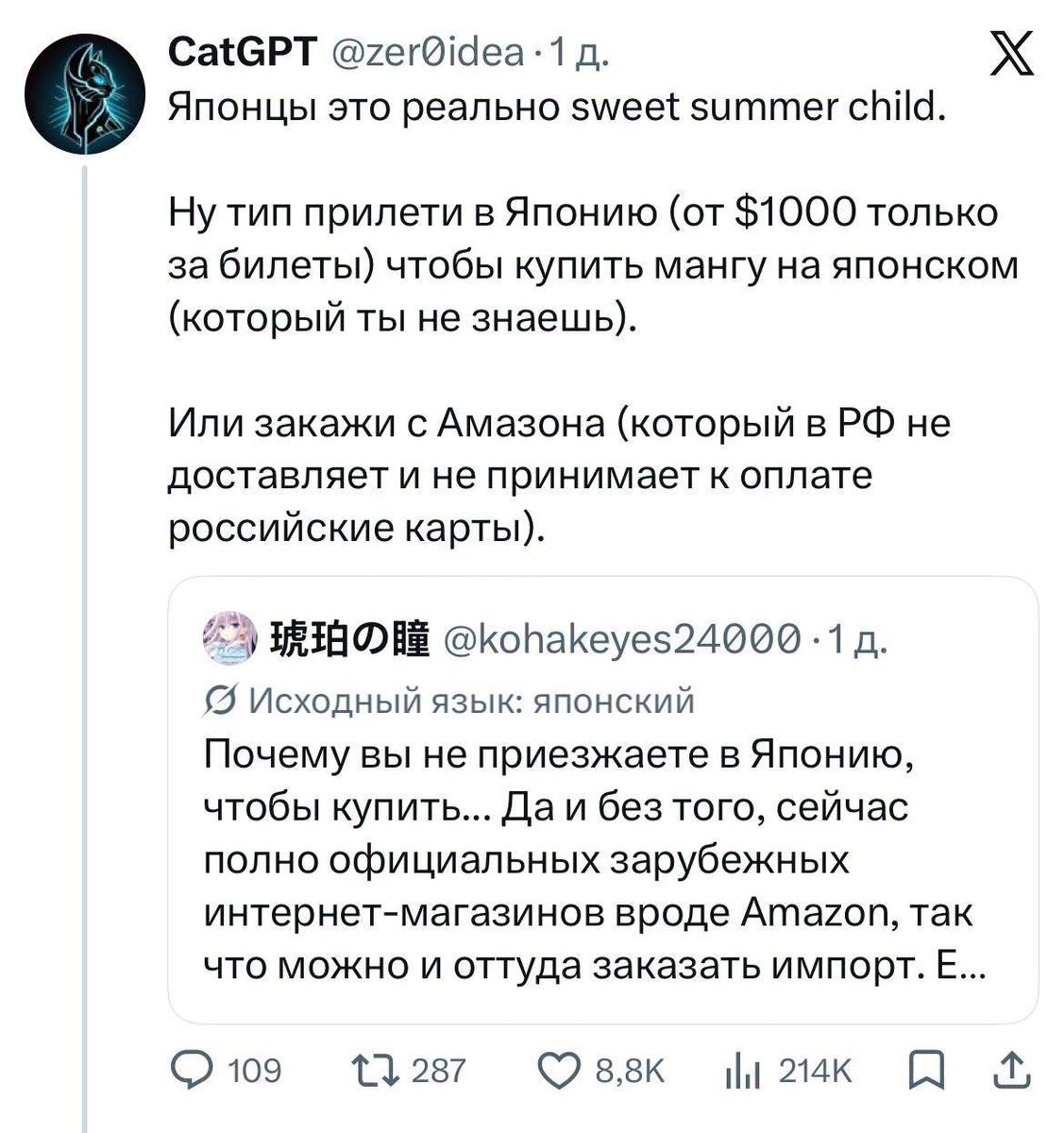 Не за политику. За аниме. В Вавилонском Твиттере — новой соцсети с автопереводом — россияне и бразильцы начали признаваться японцам в любви к их культуре. Манга, аниме, всё такое. Японцы растаяли. А потом выяснилось, что доступ к контенту был получен не совсем легально. Атмосфера изменилась мгновенно. Часть японцев ответила в духе: «нет официального доступа — прилетайте и покупайте здесь». Самые радикальные пригрозили спиратить Достоевского в отместку. 🙂 Это, конечно, смешно. Но за этим срачем стоит реальная проблема: огромные рынки годами не получали легального доступа к контенту — и адаптировались как могли. Пиратство там не про жадность, а про отсутствие альтернативы. Когда барьер не цена, а география — претензии к пользователям выглядят странно. Голоса разума с обеих сторон тоже звучали. Будем надеяться на мирный исход.