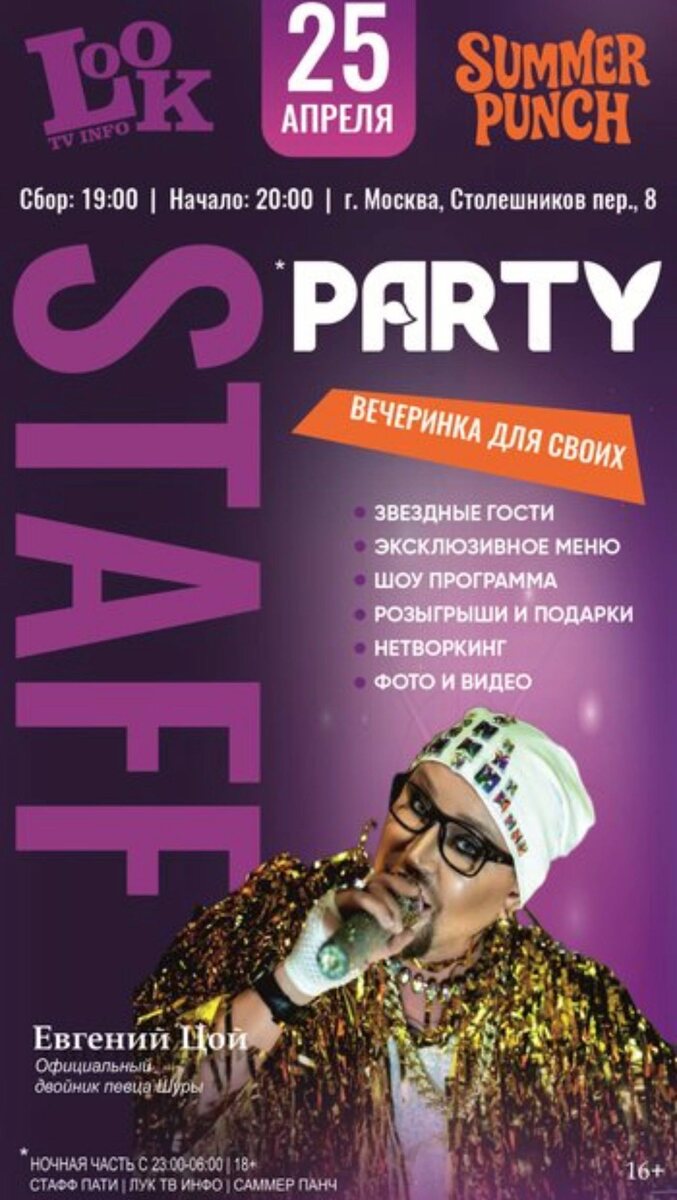 ! Готовы зажечь? 🔥 LOOK TV INFO совместно с баром Summer Punch приглашает вас на эксклюзивную STAFF PARTY в самом сердце города! Это будет не просто вечеринка, а настоящий эпицентр стиля, музыки и новых знакомств. Мы собираем лучших из лучших — «своих» — чтобы создать незабываемую атмосферу и оторваться на полную! Что вас ждёт на STAFF PARTY? ⭐️ Звёздные гости: Популярные блогеры и медиа-лица России и СНГ. 🍹 Эксклюзивное меню: Специальные угощения и, конечно, великолепный пунш от Summer Punch. 🎤 Шоу-программа: Яркие выступления артистов, которые не дадут вам скучать. 🎁 Розыгрыши и подарки: Шанс уйти не только с хорошим настроением, но и с ценными призами. 🤝 Нетворкинг: Идеальная возможность для новых знакомств в неформальной обстановке. 📸 Фото и видео: Профессиональные репортажи, чтобы запечатлеть лучшие моменты вечера. И самое главное — замечательное настроение и танцы до утра! Не пропустите главное событие этой весны. Собираемся, чтобы зажечь танцпол вместе! Количество м