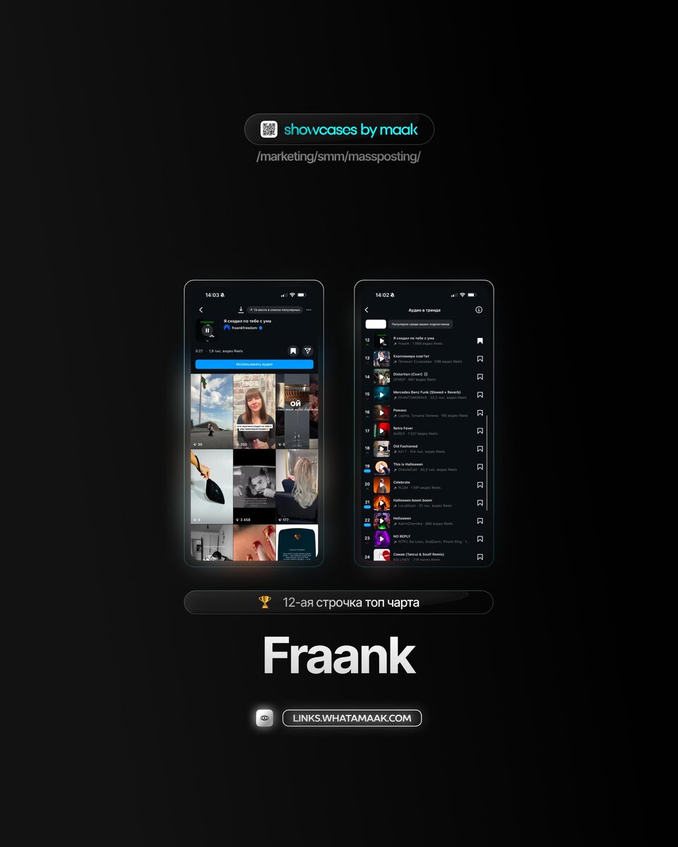 ❤️ Для кого? Fraank 🔼 Что было сделано? Массовое размещение/массовый постинг видео-контента под официальный звук ⭐️ Итог: Россия — 12-ая строчка топ чарта 🛒 Заказать 🔍 Другие услуги ℹ️ #продвижение #топчарт 🔗 maak® × подробнее • ⚡️ boost